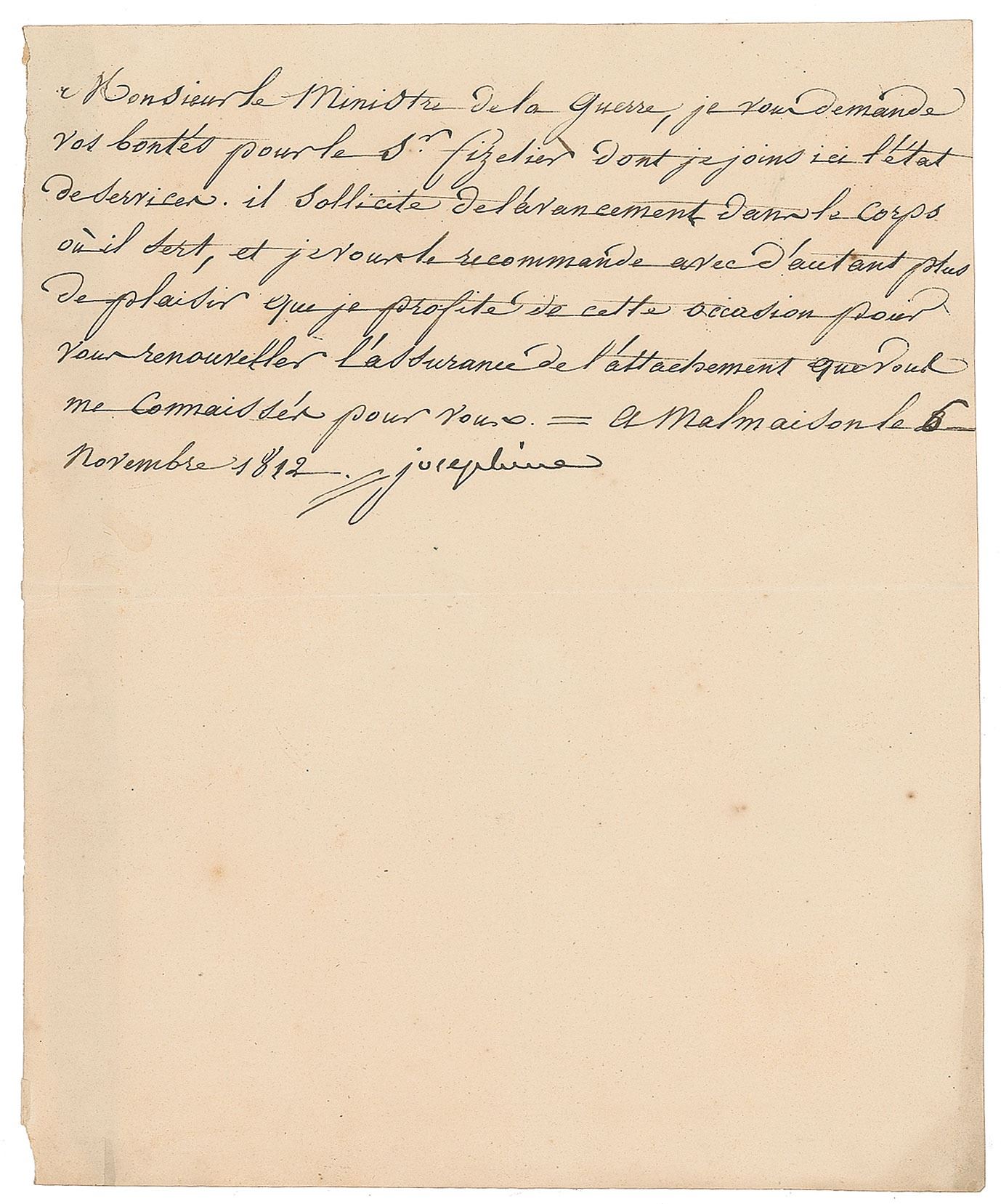First wife of Napoleon and thus the first empress of the French (1763–1814). LS in French, signed “Josephine,” one page, 7.25 x 9, November 6, 1812. Letter to the Minister of War, written from her famous Chateau de Malmaison residence on the outskirts of Paris, recommending an officer. In fine condition, with light show-through along the left edge from an old mounting strip on the reverse.
