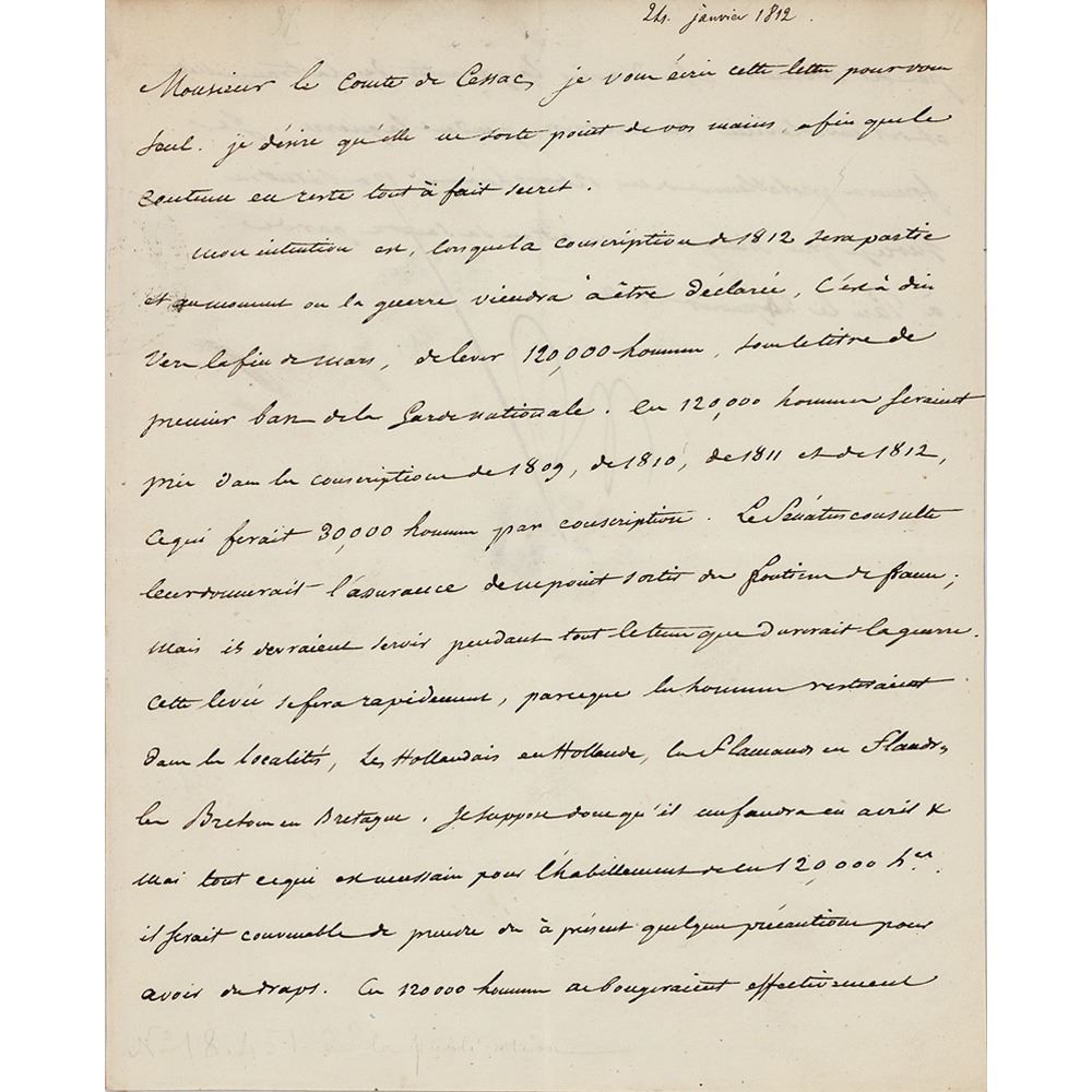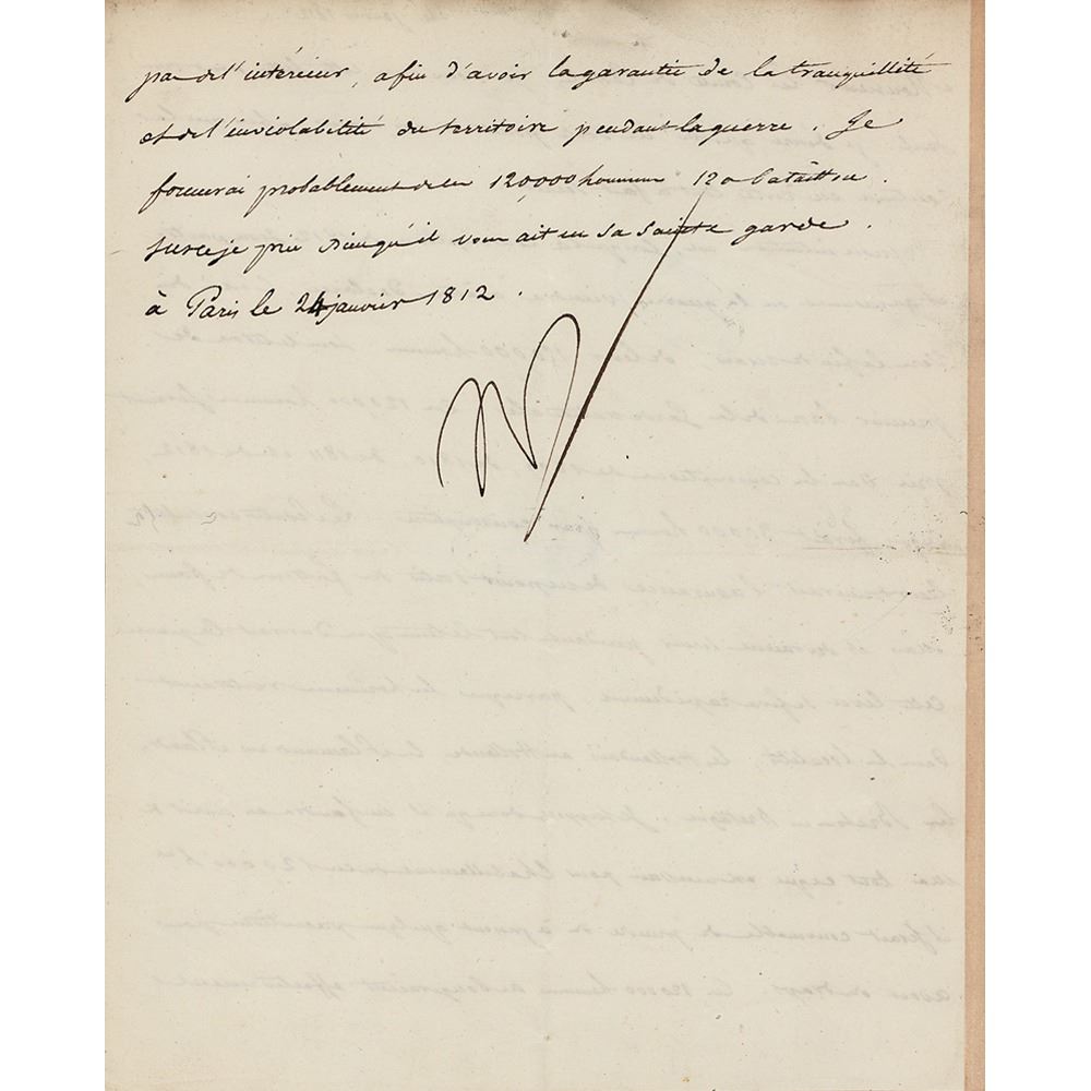 Significant LS in French, signed “Np,” one page both sides, 7.25 x 9, January 24, 1812. Untranslated letter about the organization of his Grande Armée troops for the invasion of Russia, giving orders for the recruitment of 120,000 soldiers. In fine condition, with a thin old mounting strip along the back left edge.