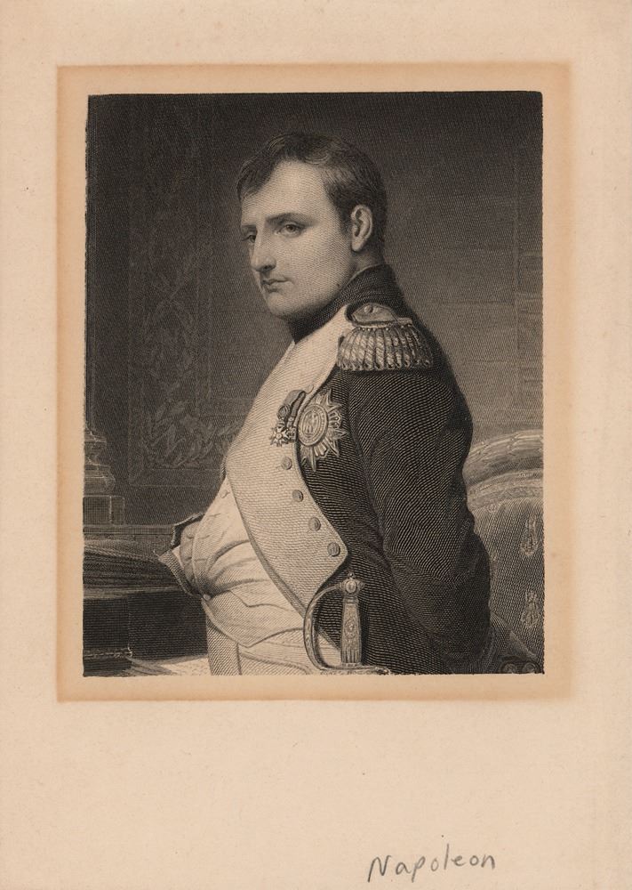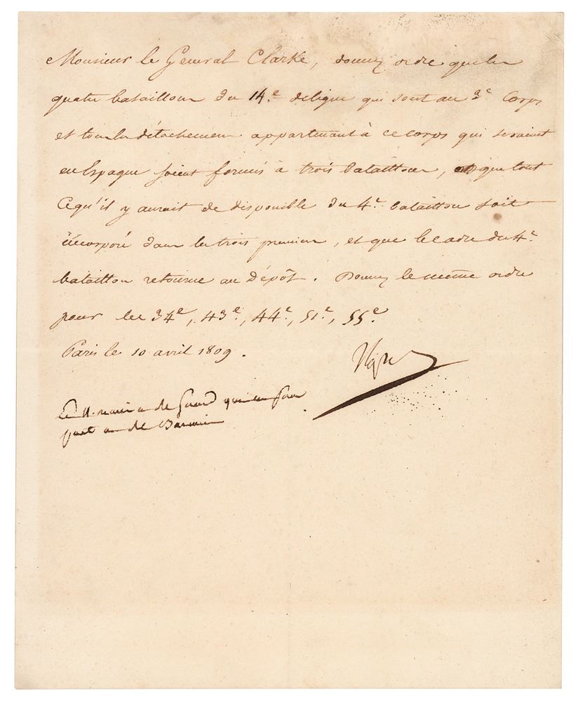 LS in French, signed "Nap.," one page, 7.25 x 9, April 10, 1809. Untranslated letter to General Clarke regarding military matters, boldly signed by Napoleon Bonaparte. In fine condition, with minor staining along the top. Accompanied by an unsigned engraved portrait.
