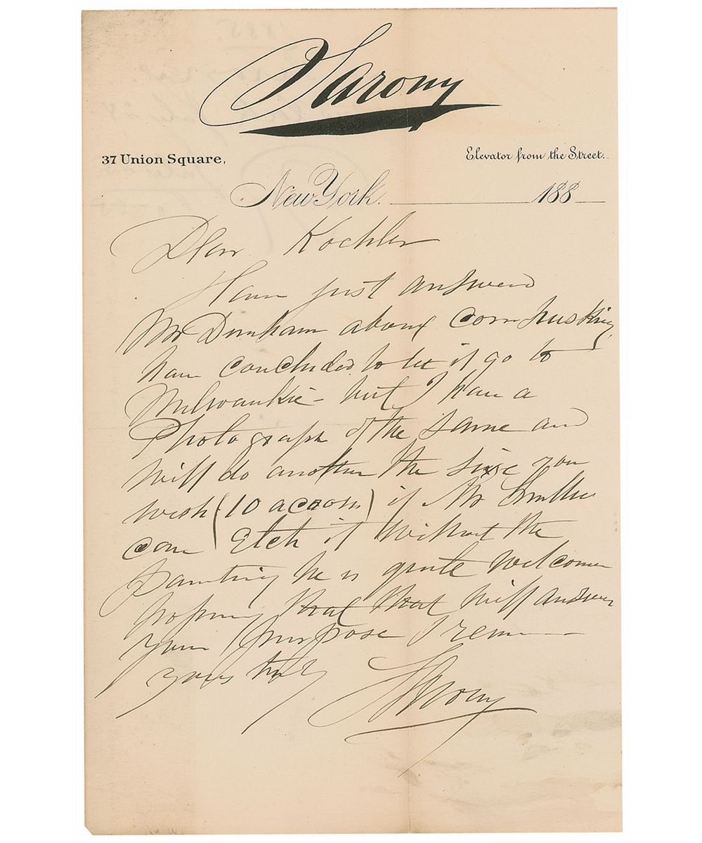 Highly popular and great portrait photographer (1821–1896), renowned for his portraits of the stars of American theater. ALS signed “Sarony,” one page, 5.5 x 8.5, personal letterhead, circa 1880s. Letter to a gentleman. In full: “Have just answered Mr. Dunham about corn husking, have concluded to let it go to Milwaukee—but I have a photograph of the same and will do another the size you wish (10 across) if Mr. Smithe can etch it without the painting he is quite welcome.” In very good condition, with intersecting folds (one vertical fold passing through a single letter of the signature), light scattered soiling, and slight show-through from docketing to reverse.