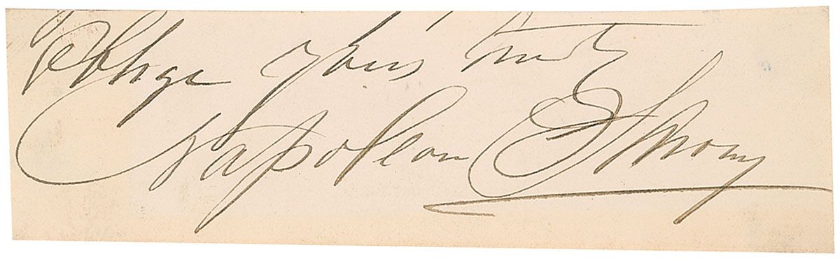 Highly popular and great portrait photographer (1821–1896), renowned for his portraits of the stars of American theater. Ink signature, “Oblige yours tuly, Napoleon Sarony,” on an off-white 4.5 x 1.5 slip clipped from the conclusion of a letter. In fine condition, with light overall toning. Accompanied by a cabinet photo by Sarony of New York.