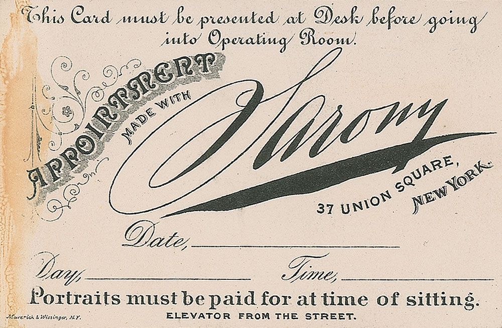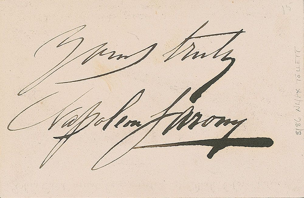 Highly popular photographer (1821–1896), renowned for his portraits of the stars of late-19th-century American theater. Bold ink signature, “Yours truly, Napoleon Sarony,” on the reverse of an off-white 3.5 x 2.25 Sarony sitting appointment card. In fine condition, with mild soiling and adhesive remnants to one edge of reverse.