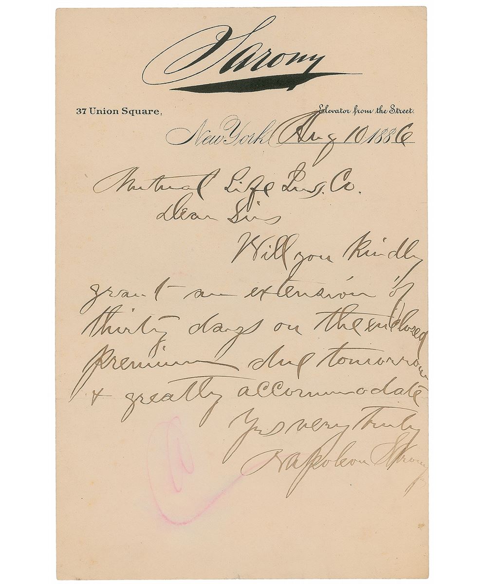 Highly popular photographer (1821–1896), renowned for his portraits of the stars of late-19th-century American theater. ALS, one page, 5.5 x 8.25, personal letterhead, August 10, 1886. Letter to Montreal Life Insurance, Company, in full: “Will you kindly grant an extension of thirty days on the enclosed premium due tomorrow & greatly accommodate.” Partially erased red notation to lower portion (affecting start of signature), a paperclip impression to lower edge, and last name of the signature a shade light, otherwise fine condition.