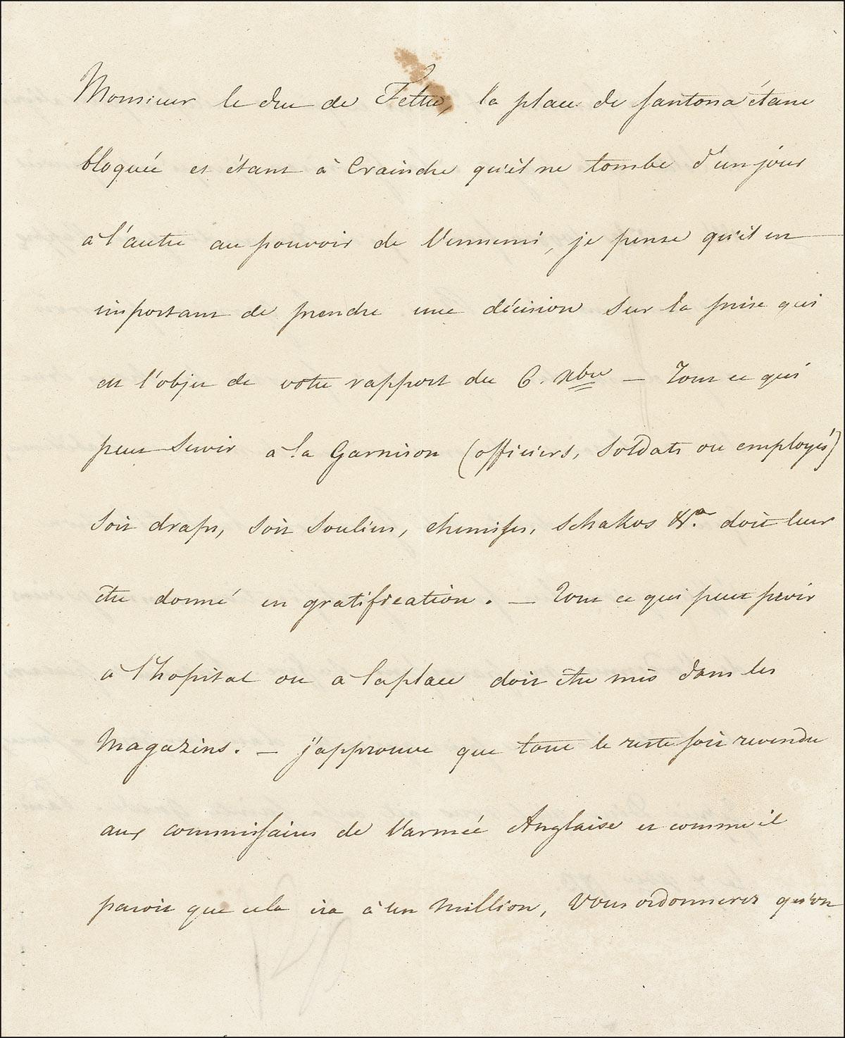 LS in French, signed “Np,” one page both sides, 7.5 x 9, February 7, 1813. Letter to his Minister of War, the Duc de Feltre, written shortly before the fall of the city of Santona in Spain, ordering his soldiers all the payments they need and all the goods they can find in the city as gratitude for their service and loyalty. In full, translated: “The ground in Santona being blocked and being feared to fall to enemy power any day, I think that it is important to make a decision about the seizure that is the object of your report on Nov. 6 – Everything that can be useful to the garrison (officers, soldiers or employees) either sheets, either shoes, shirts, schapkas [hat] [Could be abbreviation for Russian] should be given to them as gratification. – Everything that can be useful to the hospital or to the ground must be put in the quartermaster’s stores. – I approve that all that is left be resold to the English army commissaries and since it is said that it will reach one million, you will order that be kept in Santona 1st all that is necessary to balance the pay to the garrison up to January 1, 1814 and 2nd the 1000,000 francs that are requested for supplying the ground. – The garrison could also ask that it be provided with things that it needs, if not in supplies at least in clothing. As regards to what the garrison is entitled to, the distribution of gratification clothes that it will get, as I just ordered seems to me sufficient. Nobody can have any rights on a seizure entering a port. – And now I pray to God that he keeps you in his Holy guard.”