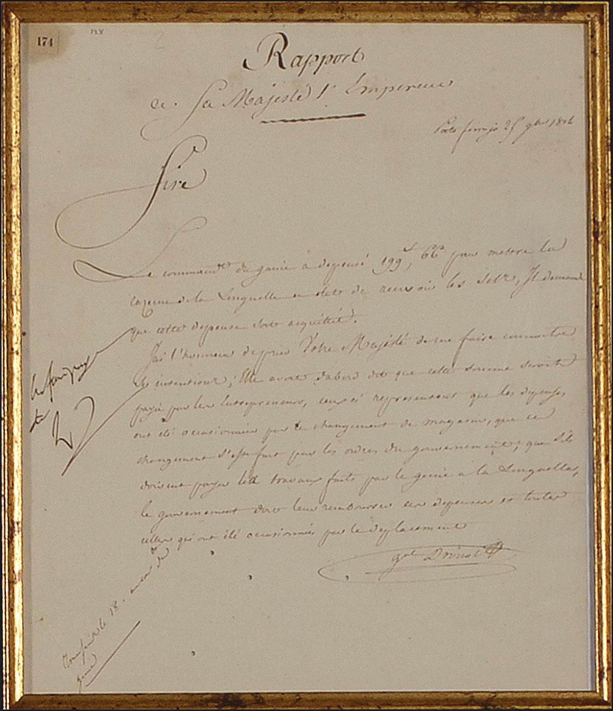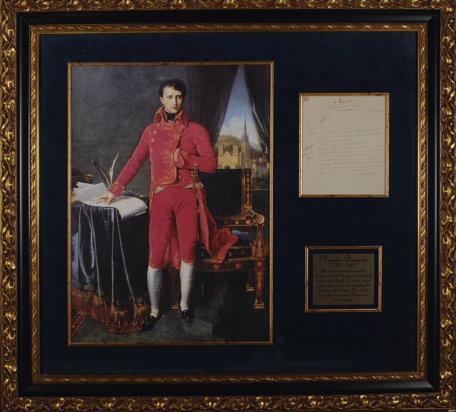 Ink endorsement, “Have them paid, Np,” on the left side of a 8.25 x 9.75 manuscript document, in French, dated September 25, 1804, from General Drouot. The document reads, (translated): “The engineering commissioner spent f199.66 for repairs aimed at making the barracks at Linguelle ready to receive troops. He asks that the expense be covered. It is my privilege to beg your Majesty to let me know of His intentions; at first You said that this sum should be paid by contractors…who represent that the expenses are the result of stores being moved, that this move was ordered by the government etc, and that if they have to pay for the work done by the engineers’ corps…the government must reimburse those costs as well as all expenses caused by the move.” Grandly and massively suede matted and framed with a large color image of Napoleon on canvas, and a biographical plaque, to an overall size of 45 x 42. In fine condition, with a small spot of toning from an old label affixed at top left, a few stray ink marks, and a light shade of overall toning to page.