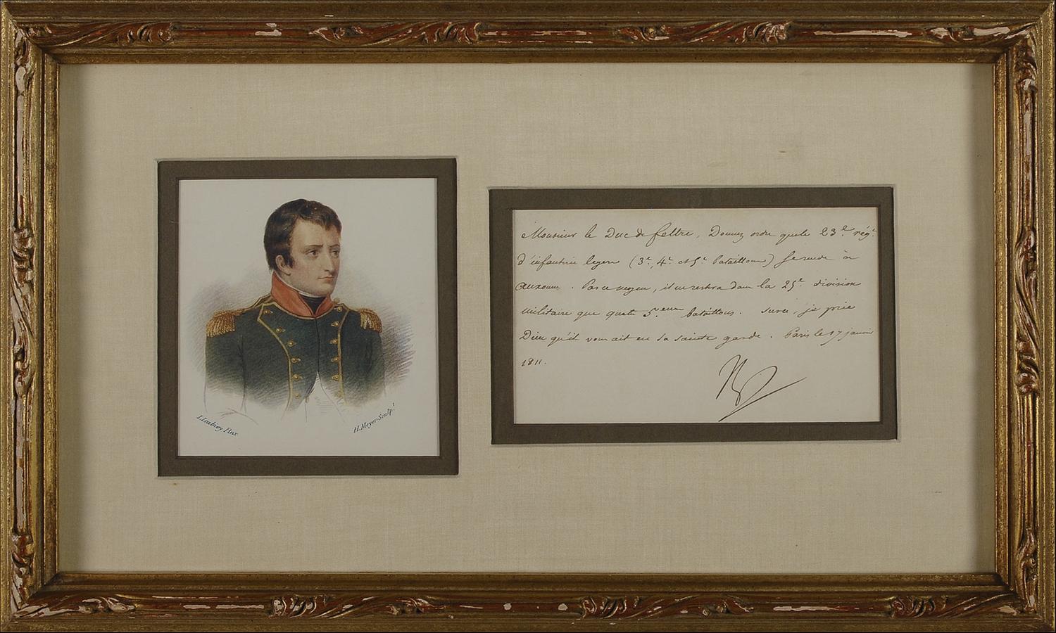 DS in French, boldly signed “NP,” one page, 7 x 4, dated January 7, 1811. An untranslated military assignment. Nicely double cloth-matted with a color portrait and framed to an overall size of 20.25 x 12.25. In fine, crisp condition. This military assignment came as tensions increased in the alliance between France and Russia which, one year later, would lead to Napoleon’s disastrous invasion of Russia. Accompanied by a letter of authenticity from James Spence.