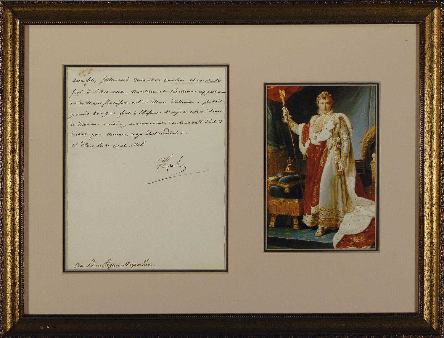 LS in French, signed “Napole,” one page, 7 x 9, April 21, 1806. Letter to his son, Prince Eugene Napoleon. In full: “My son, tell me how many muskets are in Palma nova, Mantoue and Peschiera, appurtenances belonging to the French artillery & the Italian artillery. I must have 8 or 9000 muskets at Plaisance that I ordered to be sent to Mantoue to accelerate this movement; they had been originally intended to Ancône, which was ridiculous.” Double matted and framed with a color portrait of Napoleon in royal garb, to an overall size of 19.5 x 15. In fine condition, with some scattered light creases and wrinkles, and a small area of toning to top left corner.