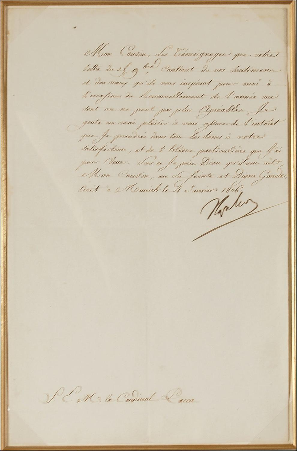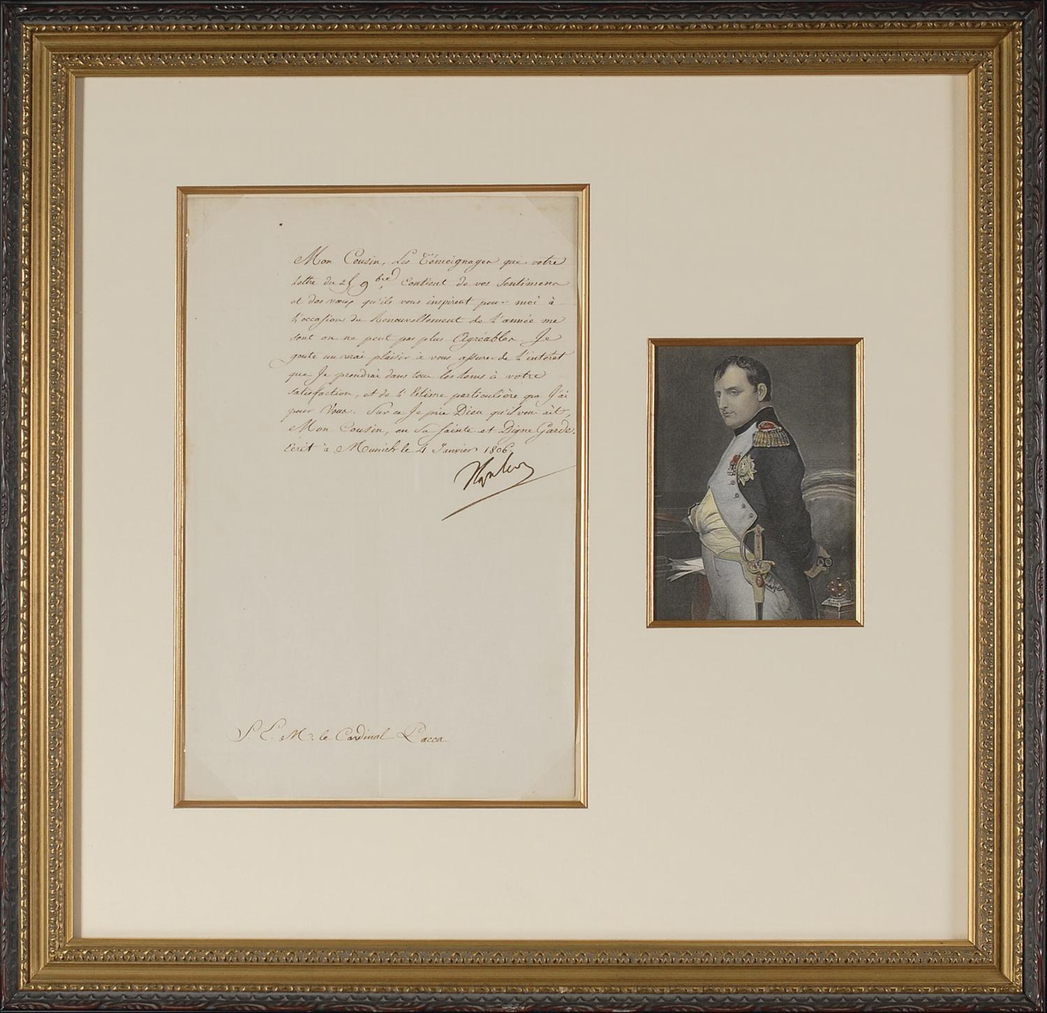 LS in French, boldly signed in full, “Napoleon,” one page, 8 x 12.25, January 1, 1806. Letter to Cardinal Pacca. In full (translated): “My Cousin, Your feeling and wishes for the new year expressed toward me in your letter of October … 25 could not please me more. It is a real pleasure to assure you of the interest that I will take to keep everything to your satisfaction, and of the special esteem that I have for you. And now, My Cousin may God be with you.” Matted and framed with a color portrait of Napoleon, to an overall size of 21.25 x 21. In fine condition, with two horizontal folds and a bit of scattered light toning and foxing.