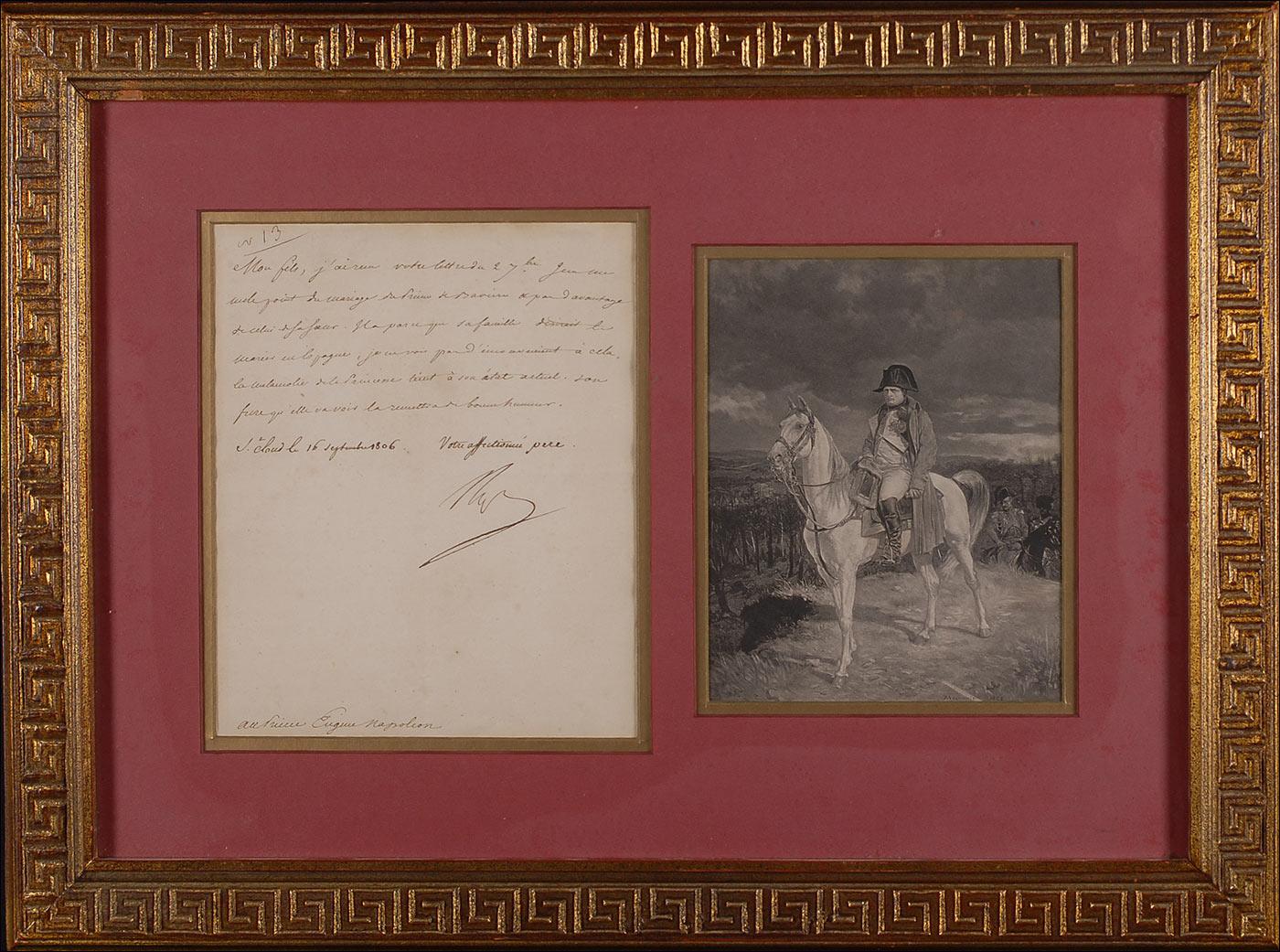 LS in French, signed “Nap,” one page, 7.25 x 8.75, September 16, 1806. Letter addressed to “Mon fils.” In full (translated): “My son, I have received your letter from … 27. I do not interfere to Prince of Bavaria’s wedding nor to the one of his sister. [?] because his family desired to marry him in Spain, I do not see any inconvenience to this. The princess melancholy is because of her present condition. Her brother whom she is going to see will put her back in a good mood.” Double matted and framed with a portrait of Napoleon on horseback to an overall size of 22 x 16.5. In fine condition, with central horizontal and vertical mailing fold, and a uniform shade of mild toning. An interesting letter showing Napoleon’s ability to balance political and military commitments.