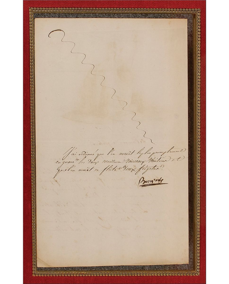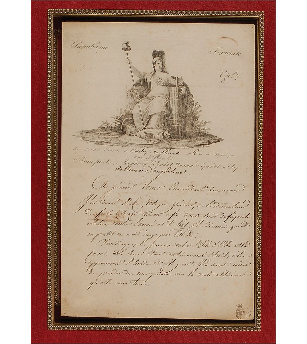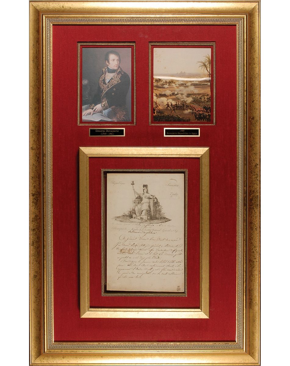 LS in French, signed “Bonaparte,” one page both sides, 9 x 13.5, attractive partly printed “Bonaparte, Member of the Institut National, General in Chief of the Army of England” letterhead, May 18, 1798. Letter to “General Vence, Commander of the Armies.” In full (translated): “I have given orders, Citizen General, to the ordinance commissioner to equip twelve dispatch boats to maintain frequent contact between the army and the port. I should like to dispatch at least two every 10 days. You will send the first ones between the islands of Elba and Corsica. As the channel is extremely narrow they should be able to find out if the Iseadre can use this route. At the same time they will find out from Intelligence about the lower route she used. I have ordered the two best Venetian vessels to be armed for war and two frigates to be equipped as cargo boats.” Letter is nicely cloth matted and framed by Kenneth R. Laurence Galleries, so both sides may be read, to an overall size of 15.25 x 20. This frame is in turn affixed by hinges on the left side to a 28 x 44 frame, which holds two color portraits and a translation of the letter. Central horizontal and vertical fold, scattered creasing and toning, and light show-though from writing and signature on reverse, otherwise fine condition.