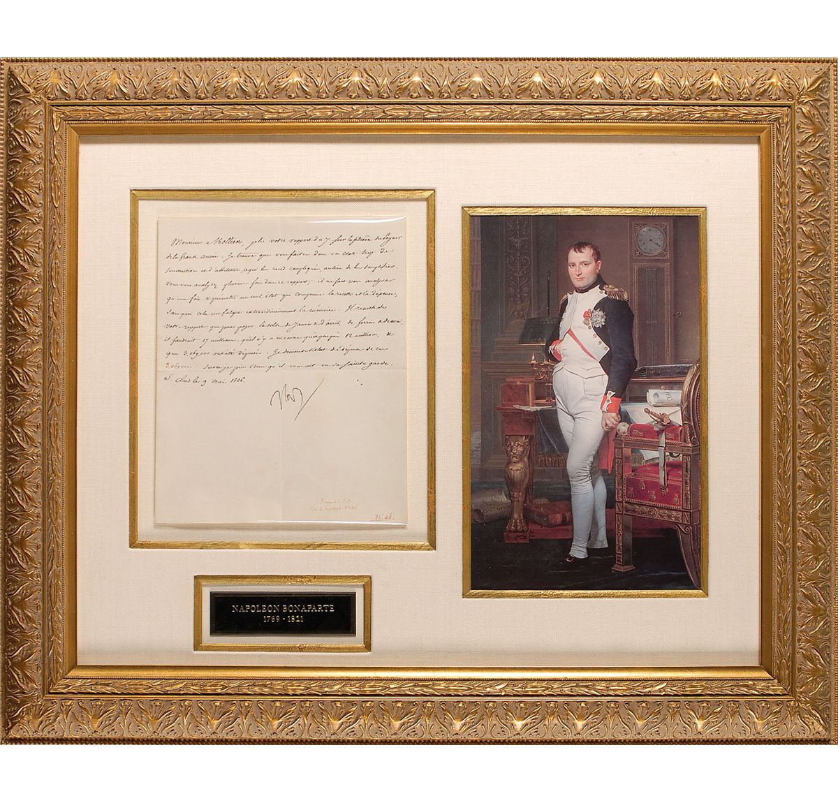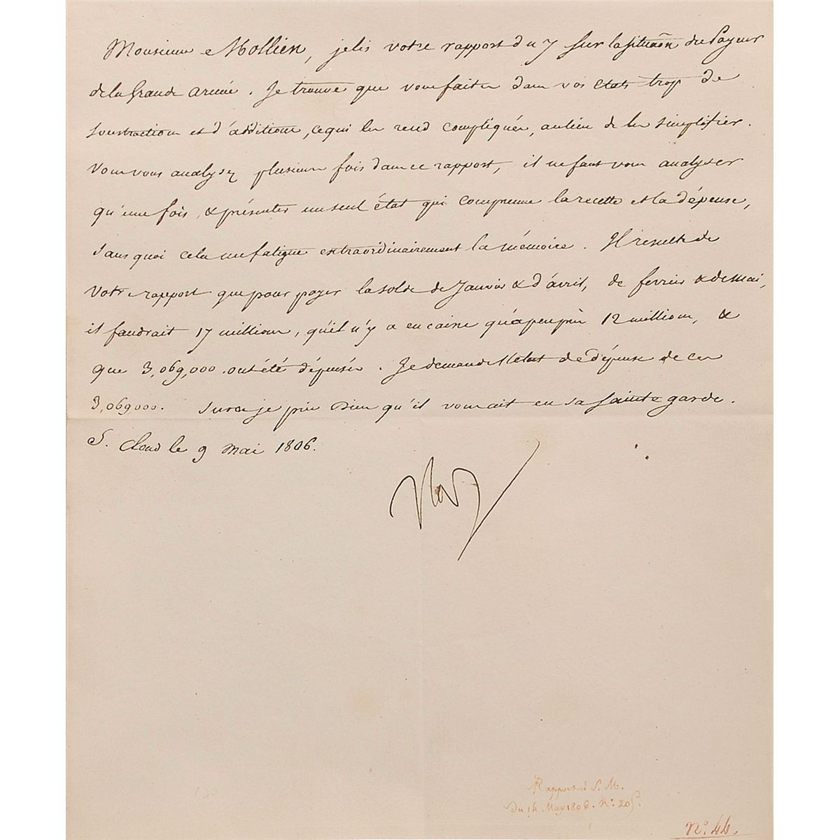 LS in French, signed “Nap,” one page, 7.25 x 9, May 9, 1806. Letter to Nicolas François, Count Mollien, in full (translated): “I am reading your report from the 7th on the Grand Army payment situation. I find that you are doing too many subtractions and additions in your statements which makes them complicated, instead of simplifying them. You analyze several times in this report, you have to analyze only once, and present one statement including receipt and expenditure, if not, it extraordinarily tires my memory. It results from your report that to pay January and April, February and May balance, 17 million would be needed, that there is only approximately 12 million in available funds, and that 3,069,000 were spent. I am requesting the spending statement of these 3,069,000.” Cloth matted and framed with a color portrait of Napoleon and a small name plaque to an overall size of 25 x 20.5. In fine condition, with central horizontal and vertical fold, with vertical fold passing through first letter of signature, a couple spots of light toning, and ink notations along bottom.