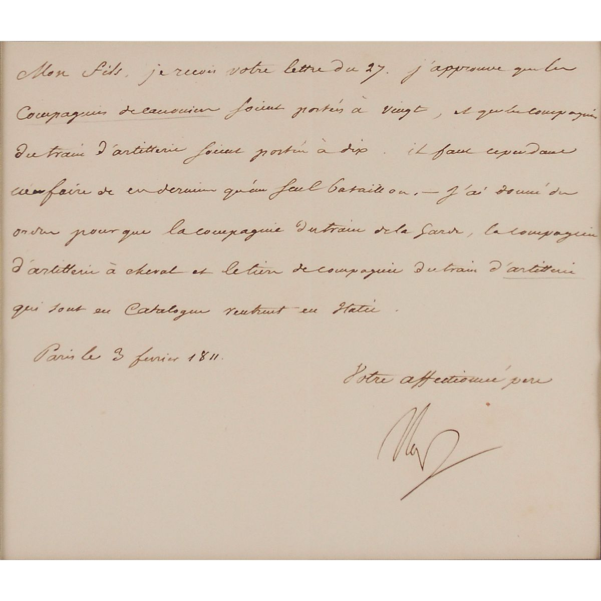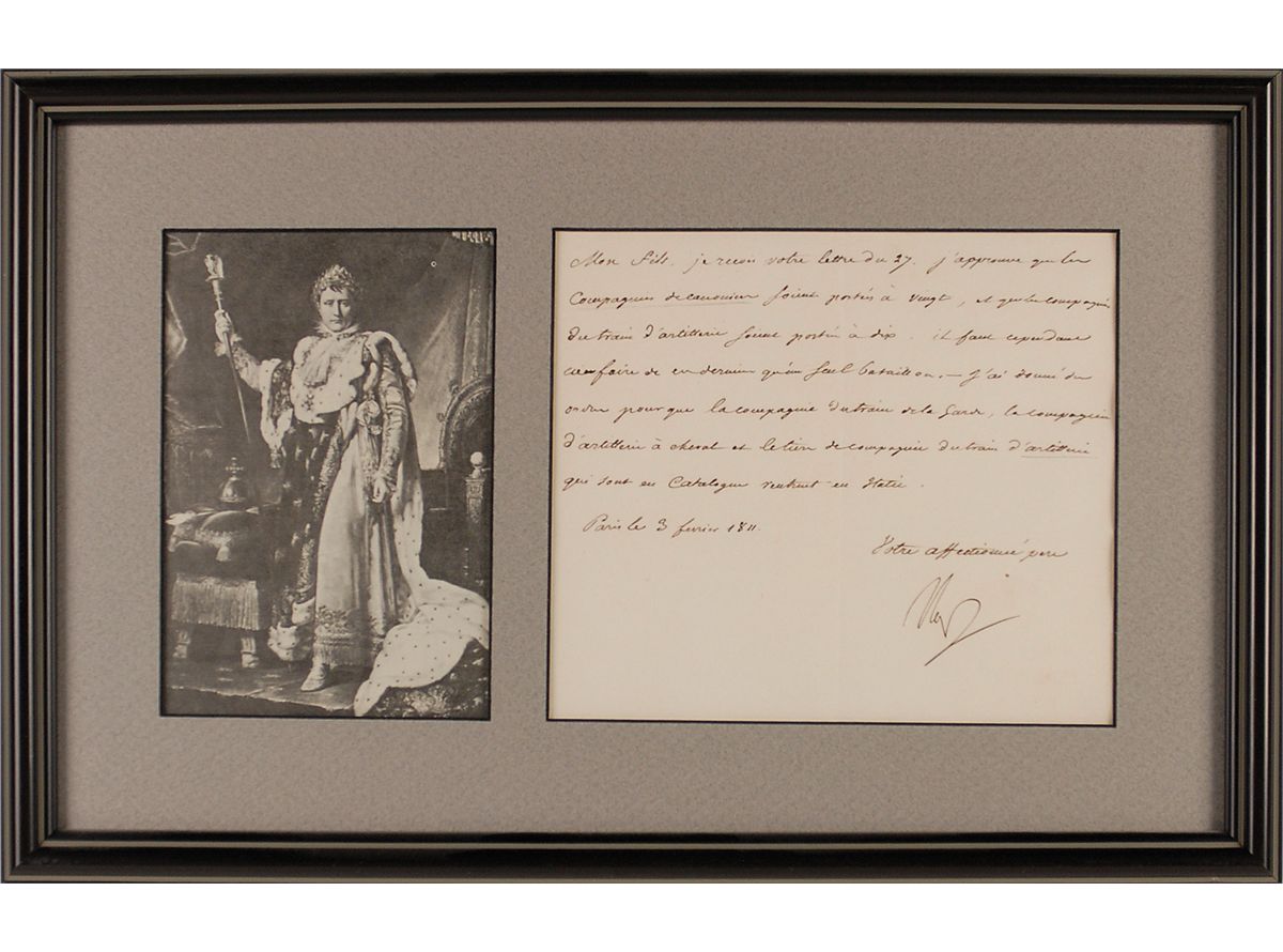LS in French, signed “Your affectionate father Nap,” one page, 7 x 6, February 3, 1811. Letter to his son. In full (translated): “My son, I am receiving your letter from the 27th. I approve that the gunner’s companies be brought to twenty and that the artillery train be brought to six. However, it is needed to make only one battalion of the latter. I have given orders for the guard artillery train, the horse artillery and a third of the artillery train company who are in Catalonia return to Italy.” Matted and framed with a portrait of Napoleon in his robe to an overall size of 16 x 10.25. In fine condition, with intersecting folds and some scattered light toning.