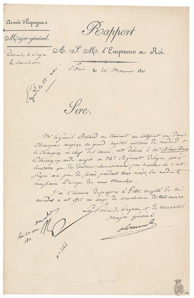 Manuscript DS, in French, signed “Accorde, Np,” one page, 8.25 x 12.75, March 20, 1811. Report to Napoleon by Alexandre Berthier. In part (translated): “General Belliard has sent me a certificate signed by two chief surgeons of the Grand Military Hospital in Madrid and the Chief Surgeon of the Army certifying that Mr. Blanvillain, Surgeon in the 34th Regiment of the Line, has been unsuccessfully treated by them for rheumatic pains for 13 months. It is necessary for him to take thermal waters…proposed that Your Majesty grant a medical leave of three months.” Bibliotheca Lindesiana coronet stamp to lower right indicates provenance from the collection of the Earls of Crawford. In fine condition, with a central horizontal fold, and mild scattered creases and toning. Blanvillain had been awarded the Legion of Honor in 1807.