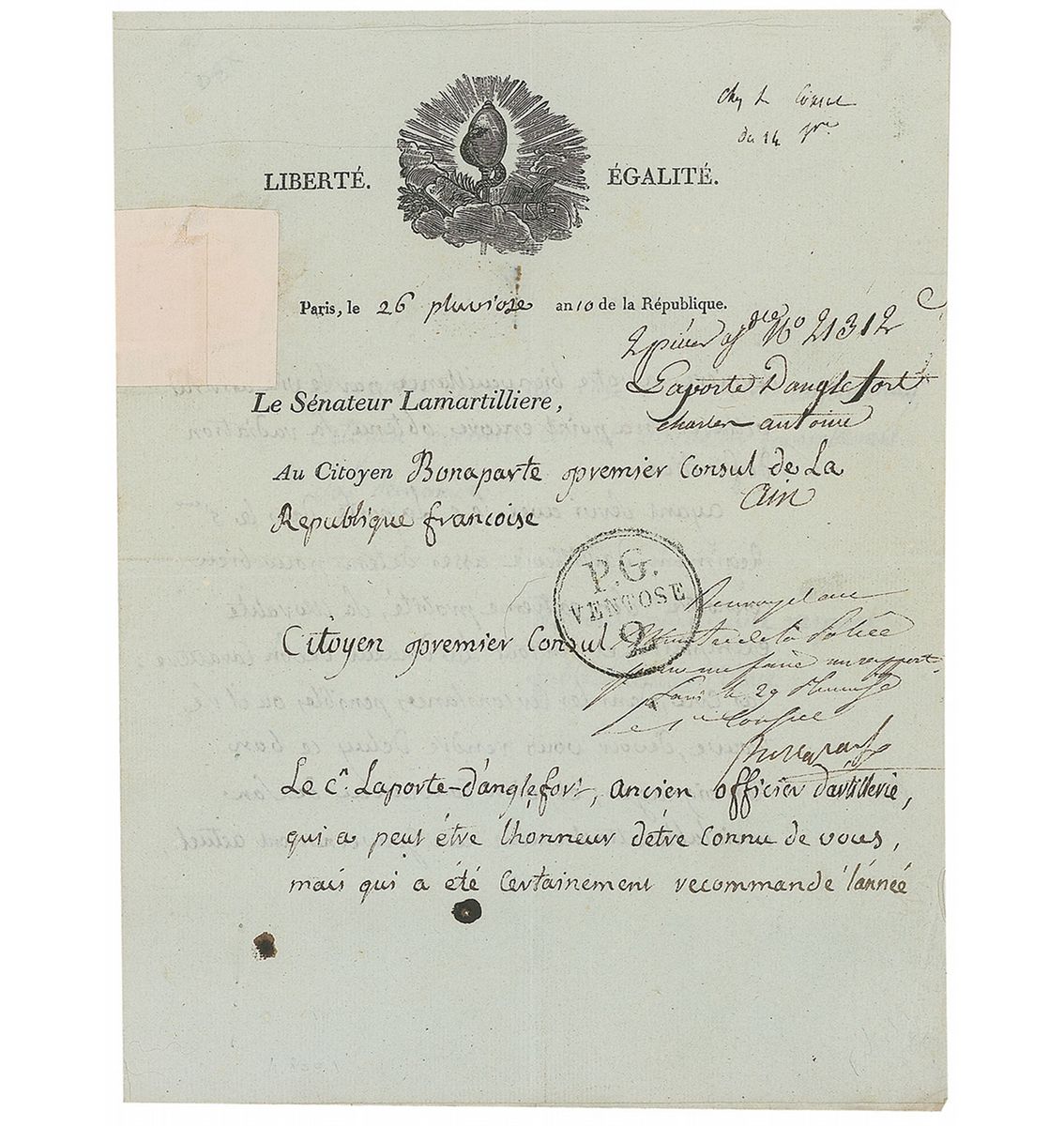 Endorsement forwarding the document to the minister of police for a report, signed “Bonaparte,” on the front of a letter in French addressed to him, three pages on two adjoining sheets, 7 x 9.25, Paris, February 15, 1802. Senator Fabre Lamartilliere write