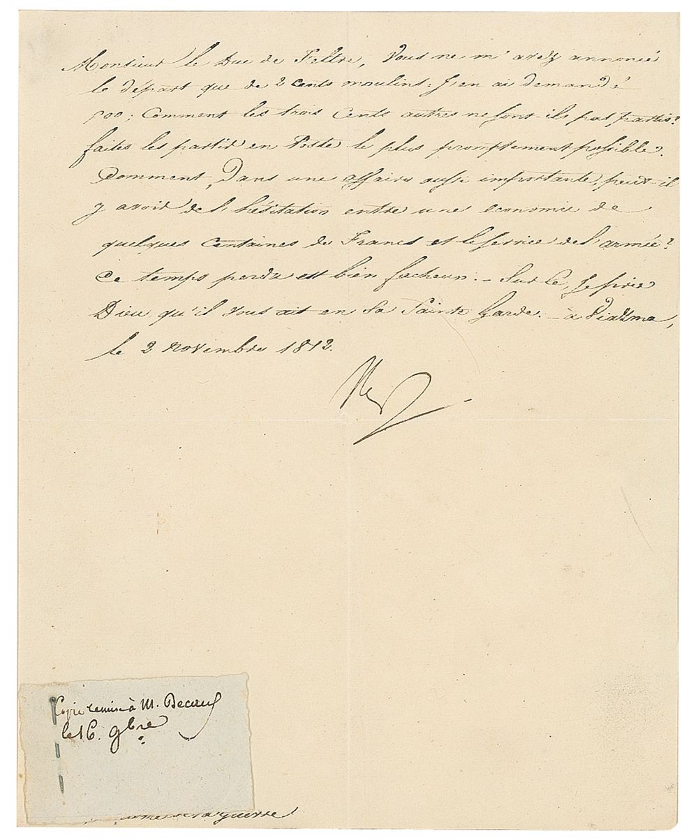 LS in French, signed “Nap,” one page, 7 x 9, Viazma, November 2, 1812. Letter to Clarke, his Minister of War. In full (translated): “You announced the departure of only 200 mills to me. I asked you for 500. How come the 300 others didn’t leave? Have them sent by post as promptly as possible. In an affair of such importance how could there be any hesitation between a saving of a few hundred Francs and the service of the Army? This time lost is quite deplorable.” A note attached by a pin at lower left reads, “Copy transmitted to Mr. Becaus Nov. 16.” In fine condition, with central horizontal and vertical folds, with the vertical fold passing though small portion of first name of signature. The next day, Napoleon lost the battle of Viazma, the last great battle of the Russian campaign. The Grande Army’s defeat was no doubt due in part to a shortage of mills for grinding gunpodwer.
