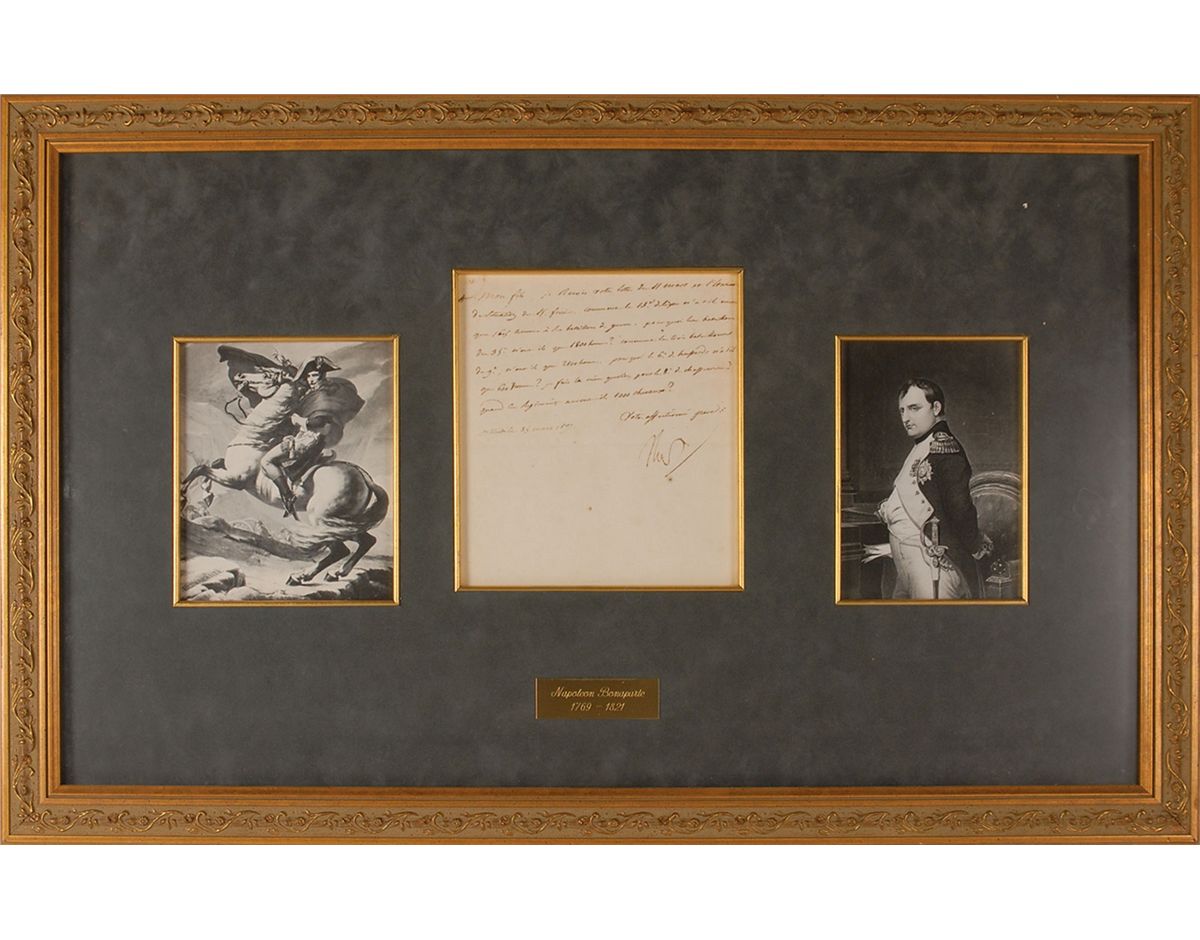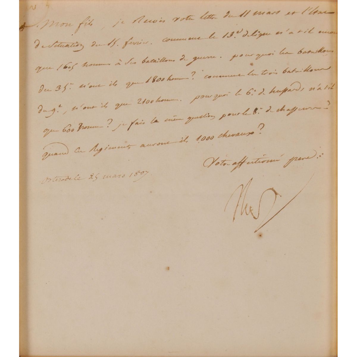LS in French, signed “Nap,” one page, 6.75 x 7.5, March 25, 1807. Letter to his son. In full (translated): “I am in receipt of your letter of the 11th of March and the report on the state of conditions of the 15th of February. How is it that the 16th of the line still has only 1,605 men in its fighting battalions? Why do the battalions of the 35th have only 1,800 men? How is it that the three battalions of the 9th have only 2,100 men? How is it that the 6th of the Hussars has only 600 men? I ask the same question about 9th of Riflemen. When will these regiments have 1,000 horses?” Suede-matted and framed with two portraits of Napoleon to an overall size of 29.5 x 18.5. In fine condition, with a central vertical fold passing through the top portion of signature. Oversized.
