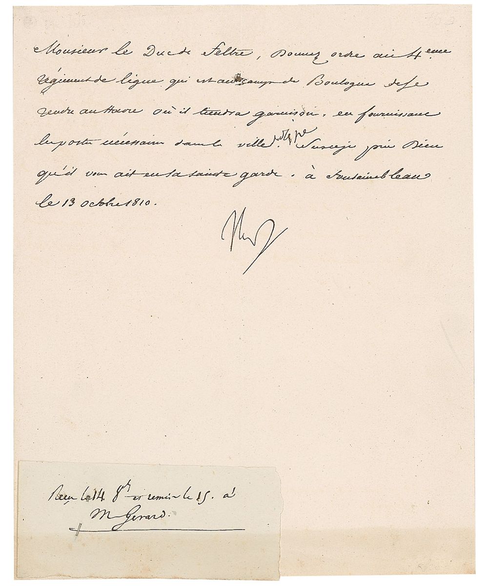 LS in French, signed “Nap,” one page, 7.25 x 9, October 13, 1810. Letter to the Duke de Feltre, Minister of War General Henri Clarke. In full (translated): “Duke de Feltre, send orders to the 4th Regiment of the line which is in the Boulogne camp, to proceed to Havre, for garrison duty, furnishing the necessary posts in the town of Dieppe. I pray God that he will have you in His Holy guard.” In the text, Napoleon has added, “Dieppe.” In the lower left is pinned a short note in French, 4 x 1.75, possibly in the hand of the Duke de Feltre: “Rec the 14th October and remitted the 15 to M. Gerard.” In fine condition, with central horizontal and vertical folds, with vertical fold passing through a single letter of signature.