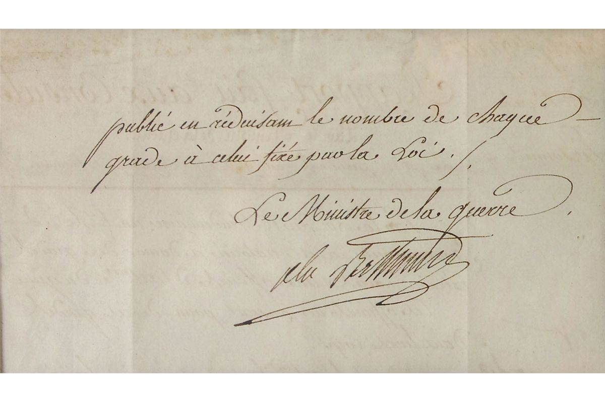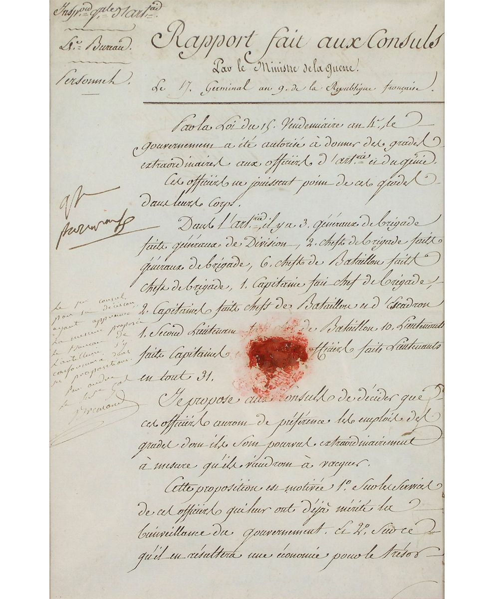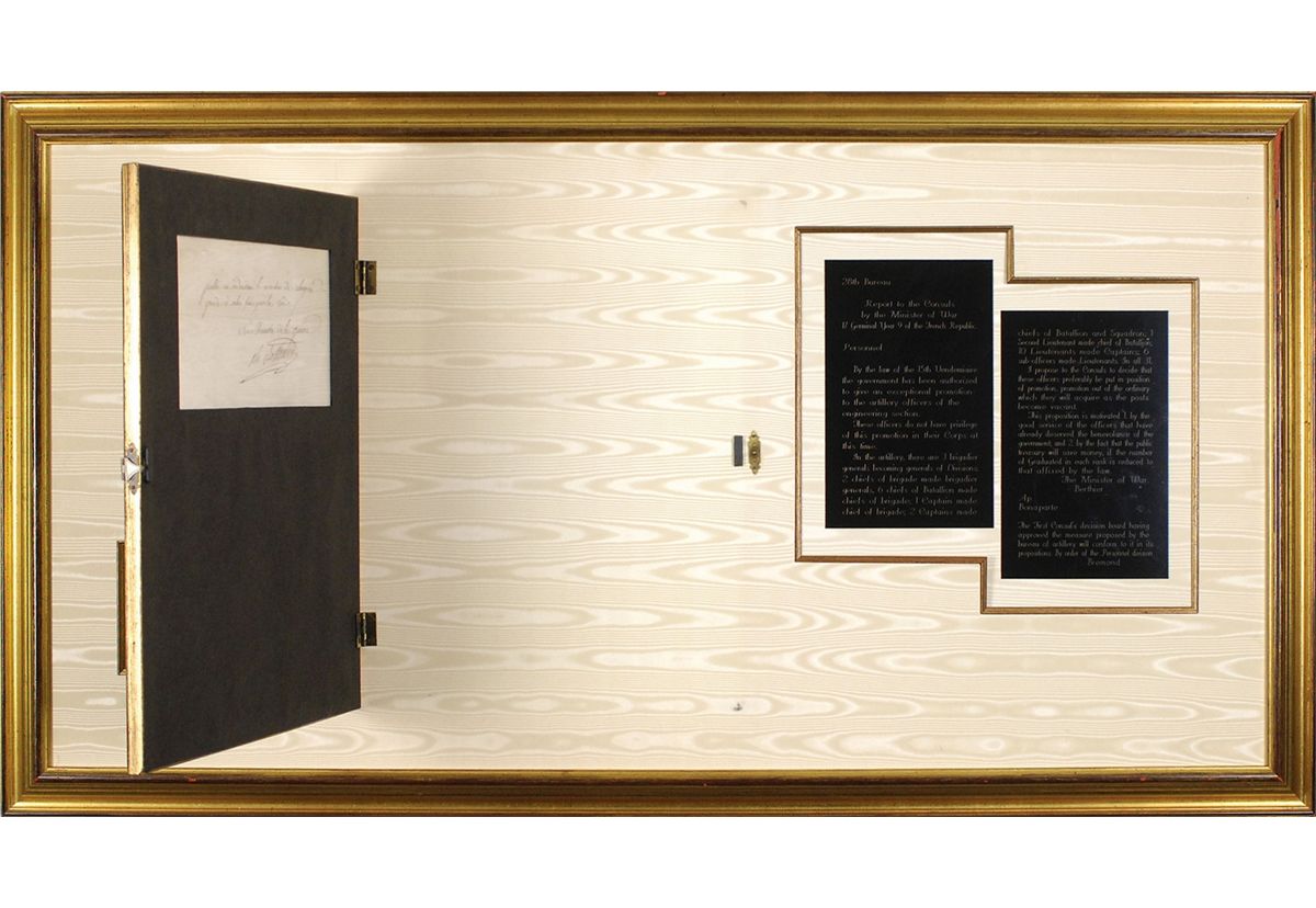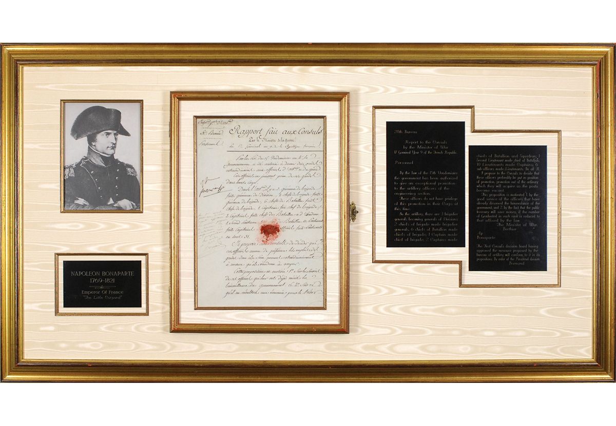 Handwritten endorsement, “Apr, Bonaparte,” as First Consul, on the first page of a manuscript document, in French, one page, both sides, 8 x 12, dated April 7, 1801. The document, signed by Napoleon’s Minister of War reads, in part (translated): “In the artillery, there are 3 brigadier generals made generals of Division, 2 cheifs of brigade made brigadier generals, 6 cheifs of Battalion made cheifs of brigade, 1 Captain made cheif of brigade, 2 Captains made cheifs of Battalion and of Squadron, 1 Second Lieutenant made cheif of Battalion, 10 Lieutenants made Captains, 6 sub-officers made Lieutenants in all 31…This proposition is motivated…by the good service of the officers that have already merited the benevolence of the government.” Beneath Napoleon’s approval, is a handwritten endorsement signed “Bremond,” and reads, in part (translated): “The First Consul approving the proposed measure by the bureau of the artillery, will conform to it in proposition. By order.” Document is matted and framed, so both sides may be read, to an overall size of 11 x 15, and affixed by hinges on its left edge to a matted and framed display with an engraved translation of the document, a small name plaque, and a portrait of Napoleon, to an overall size of 39.25 x 22. Intersecting folds, and red wax seal remnants to center of document, otherwise fine condition. Two months earlier, Napoleon had signed the Treaty of Luneville, ending the war against the Holy Roman Empire, leaving only Great Britain to stand against his empire.