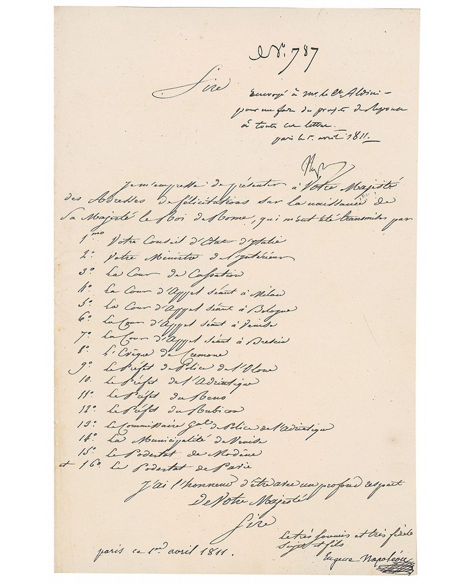 Handwritten endorsement, signed “Nap,” written at the top of an LS from his adopted son Eugene Napoleon, one page, 8 x 12.5, dated April 1, 1811, and signed “Eugene Napoleon.” The letter reads, in part (translated): “Sire, I hasten to present to Your Majesty the expressions of congratulations on the birth of His Majesty the King of Rome.” He goes on to enumerate 16 letters received from “Your Counsel of State of Italy; Your Minister of the Interior” and numerous judges, prefects, governors, and the Bishop of Cremona. At the top of the letter Napoleon writes, (translated): “Sent to Count Aldini [Italian Minister of the Interior] so that he can draw up a plan for reply to all these letters,” and also dated April 1, 1811. In fine condition. Letter bears two splendid watermarks of the imperial eagle and crown and of Napoleon crowned in victory laurels.