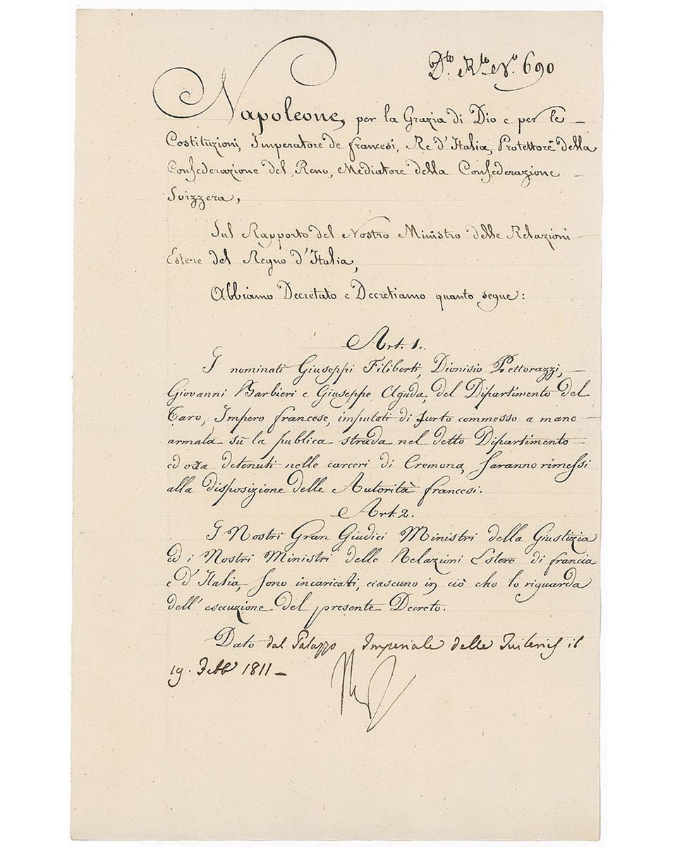 Manuscript DS in French, signed “Nap,” one page, 8 x 12.5, February 19, 1811. An untranslated decree in which four men accused of armed robbery on the public road and currently detained in the jail at Cremona are to be handed over to the French authorities. Decree charges the ministers of Justice of France and Italy with its execution. In fine condition.