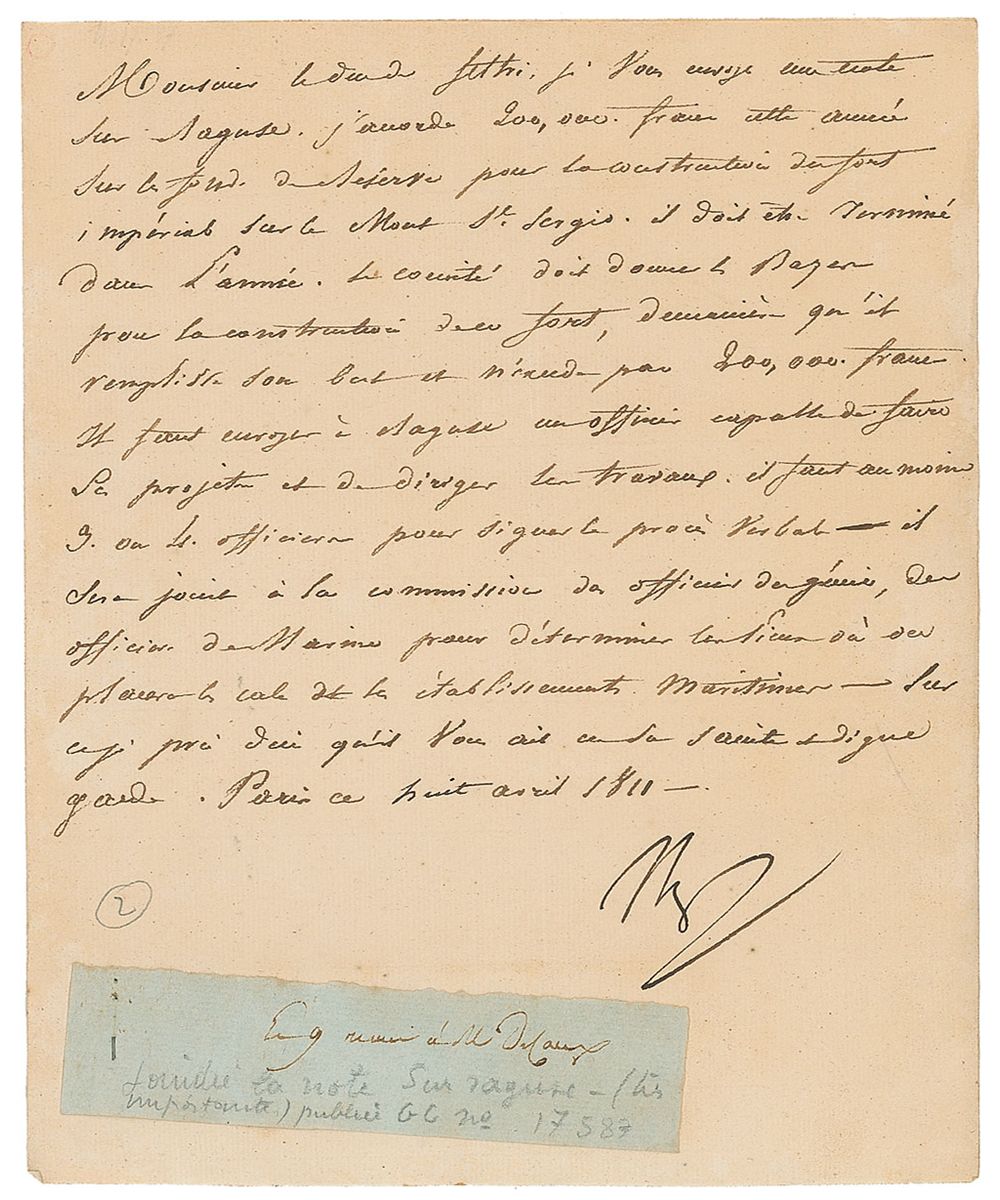 LS in French, signed “Np,” one page, 7.25 x 9, April 8, 1811. Crisply-penned letter to the Duke of Feltre, in full (translated): “I am sending you a note on Ragusa [Sicily]. I am allowing 200,000 francs this year on the reserve funds for the imperial fort construction on the Mount St. Lergio. It must be finished within the year. The committee must give the means for the fort construction in the way it can fulfill its goal and do not exceed 200,000 francs. An officer must be sent to Ragusa capable of doing the projects and be in charge of works. At least 3 or 4 officers must sign the minutes—it will be included in the corps of engineer officers and naval officers' committee to determine places where naval dock and buildings will be placed.” A small ink and pencil notation is pinned to the bottom of the page. In fine condition.
