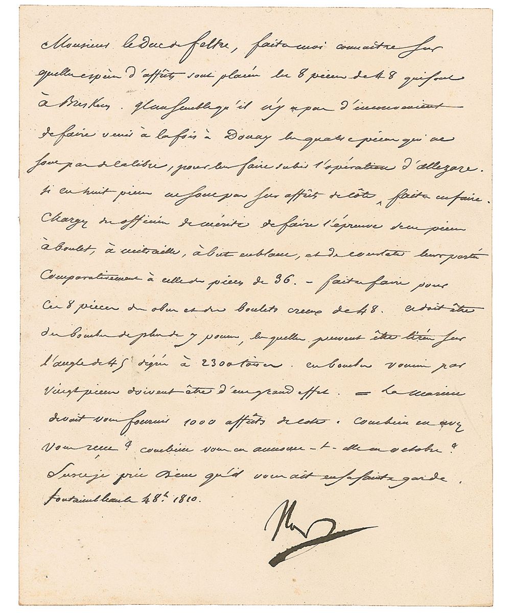 LS in French, signed “Nap,” one page, 7 x 9, October 4, 1810. Letter to the Duke de Feltre, his Minister of War. Napoleon asks him for detailed information about gun carriages, cartridges and their different calibres, “to be shot from a 45 degree angle.” In fine condition.