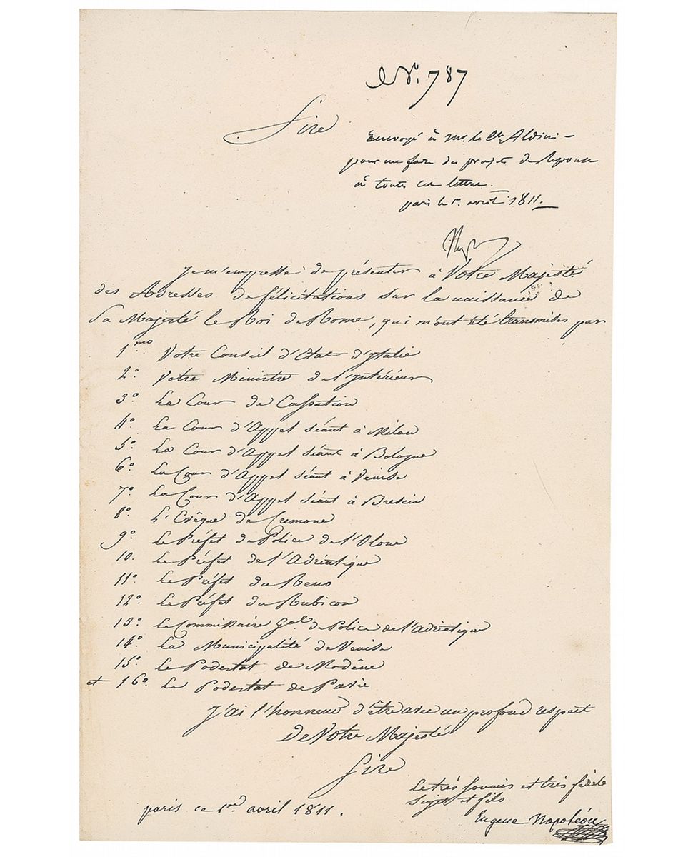 Handwritten endorsement, signed “Nap,” written at the top of an LS from his adopted son Eugene Napoleon, one page, 8 x 12.5, dated April 1, 1811, and signed “Eugene Napoleon.” The letter reads, in part (translated): “Sire, I hasten to present to Your Majesty the expressions of congratulations on the birth of His Majesty the King of Rome.” He goes on to enumerate 16 letters received from “Your Counsel of State of Italy; Your Minister of the Interior” and numerous judges, prefects, governors, and the Bishop of Cremona. At the top of the letter Napoleon writes, (translated): “Sent to Count Aldini [Italian Minister of the Interior] so that he can draw up a plan for reply to all these letters,” and dates it April 1, 1811. In fine condition. Letter bears two splendid watermarks of the imperial eagle and crown and of Napoleon crowned in victory laurels.