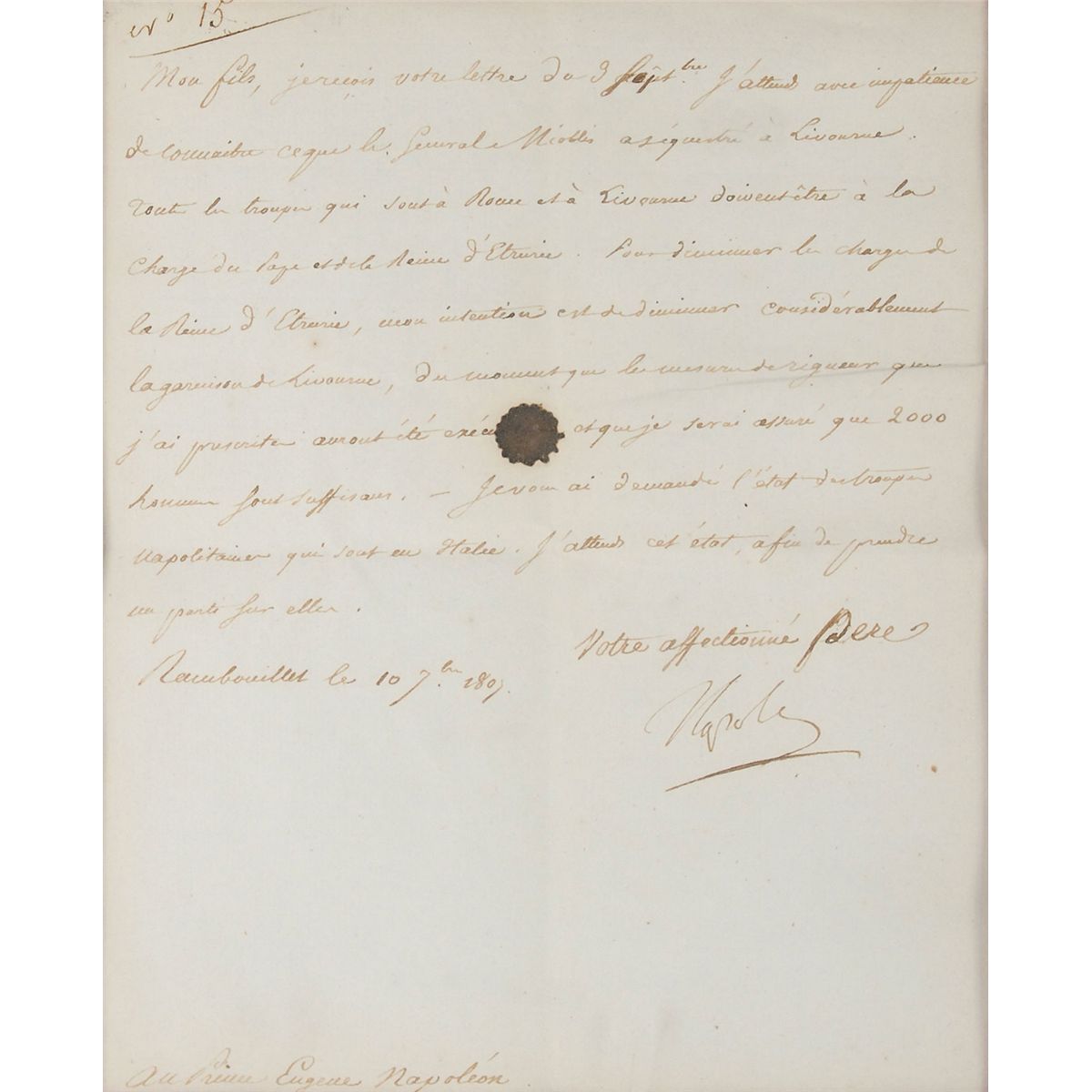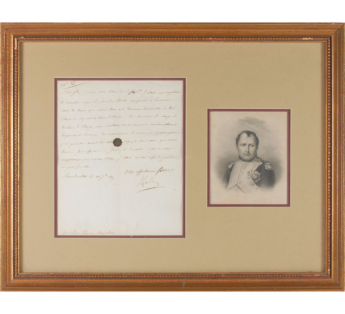LS in French, signed “Napole,” one page, 7 x 8.5, September 10, 1807. A noteworthy letter to his son, Prince Eugene Napoleon, detailing military plans for the important port city of Livorno. Loosely translated, in part: “All the troops who are in Rome and Livorno should be in the charge of the Pope and the Queen of Etruria. To reduce the load of the Queen of Etruria, my intention is to reduce considerably Garrison Livorno, as long as the austerity measures which I have set have been complied with, and that I will ensure that 2,000 men are sufficient. I asked you the state of the Neapolitan troops who are in Italy.” Double-matted and framed with a contemporary portrait engraving to an overall size of 19 x 15. In fine condition, with central vertical and horizontal folds and a stray ink blot to center.