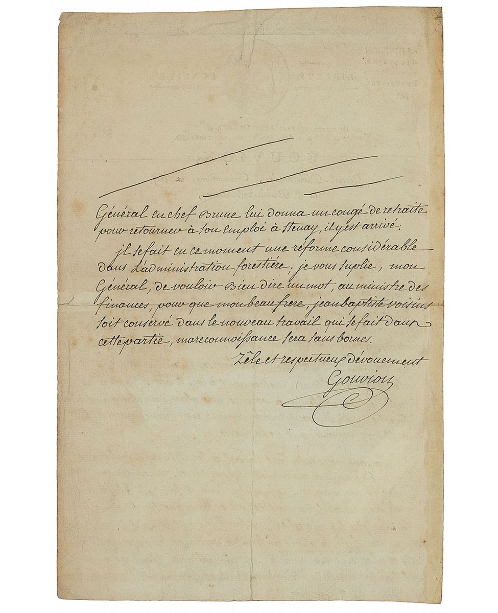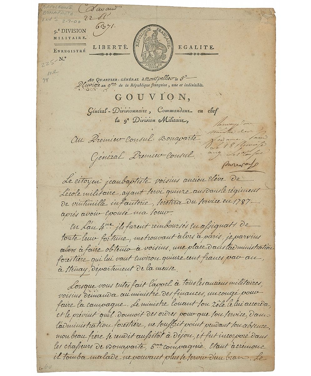 Manuscript DS in French, signed “Bonaparte,” one page both sides, 8.5 x 13.25, January 25, 1801. Untranslated. Intersecting folds and scattered toning, otherwise fine condition.