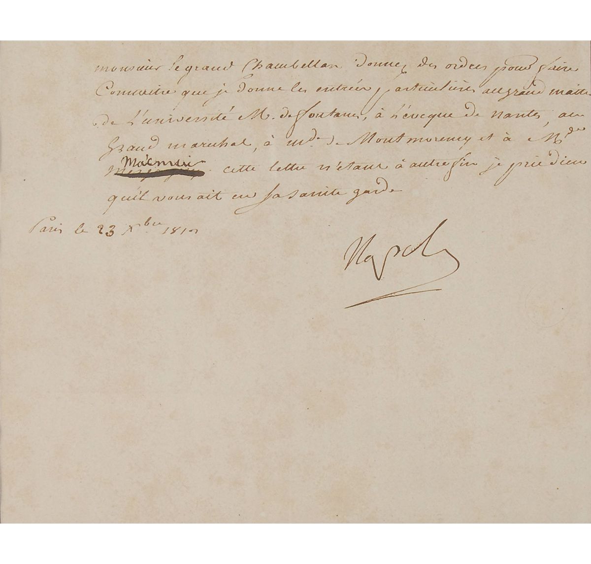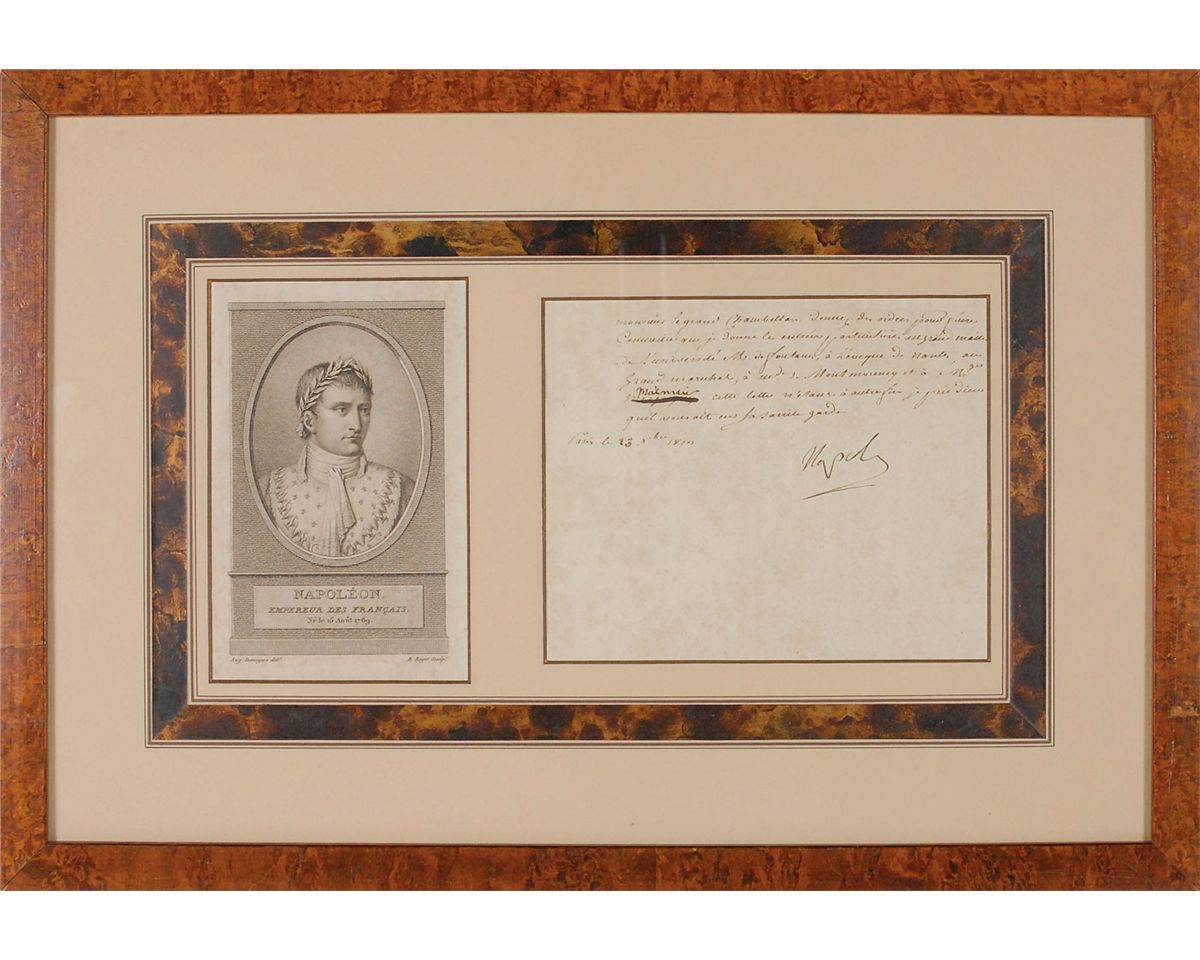 LS in French, signed “Napol,” one page, 7 x 5.75, October 23, 1817. Crisply-penned untranslated letter, nicely signed at the conclusion by Napoleon. Matted and framed with an engraved portrait of Napoleon to an overall size of 19.25 x 13.25. In fine condition, with a horizontal and vertical fold and some scattered light toning.