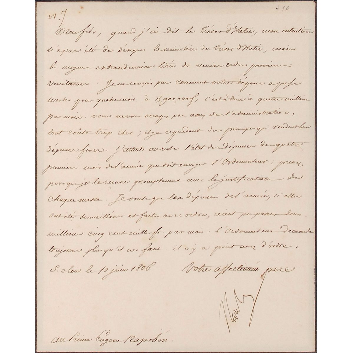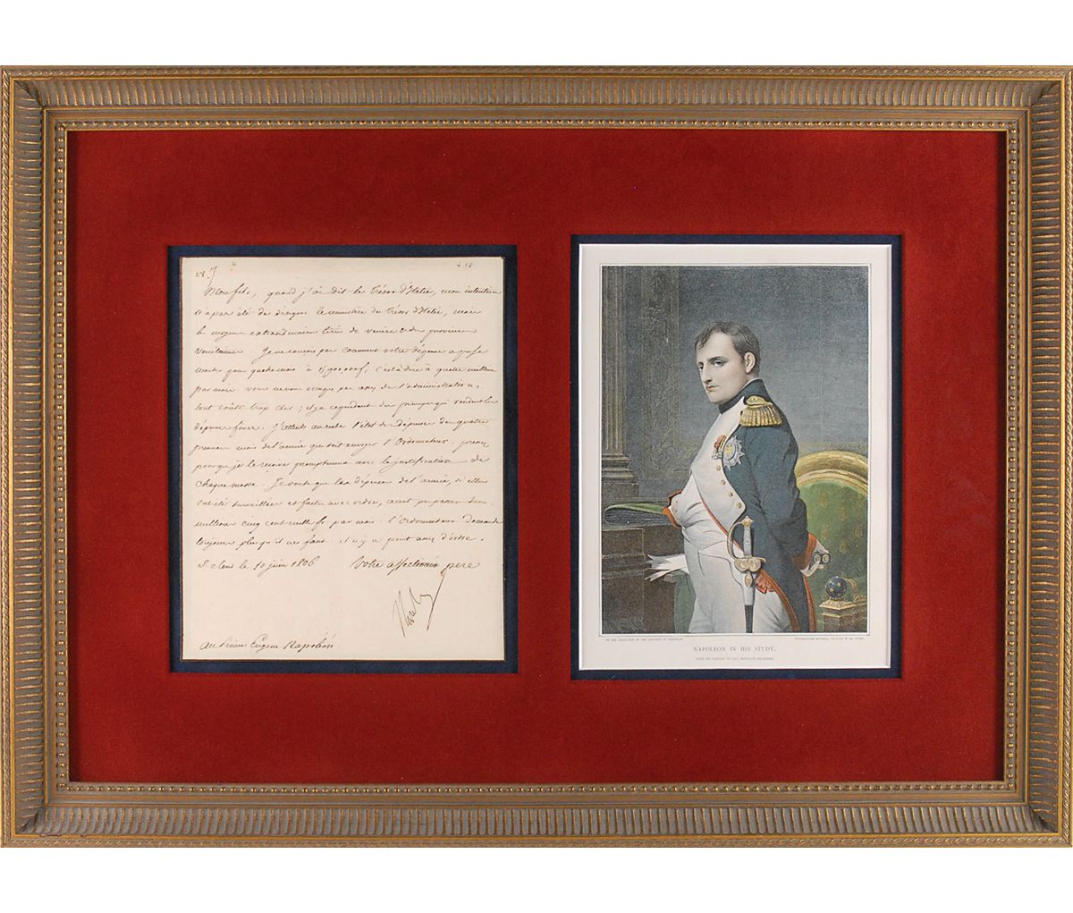 LS in French, one page, 7 x 9, June 10, 1806. Letter to his son Prince Eugene Napoleon. In full (translated): “When I said the Treasury of Italy, my intention was not to refer to the Ministry of the Treasury of Italy, but to the special levy drawn from Venice and the Venetian provinces. I cannot conceive of how your expenditures for four months could reach 15,900,000 francs, that is to say four million per month. You don’t pay enough attention to administration, everything costs too much; yet there are measures that can reduce expenses. However, I am awaiting the record of expenditures of the first four months of the year, which the Paymaster is supposed to send me. Hurry up, so that I may receive them promptly together with the justification for each [major] sum. I doubt that the expenses for the year; if they have been done carefully and with oversight, would have exceeded two million five hundred thousand francs per month. The Paymaster always asks for more than is necessary. There is certainly not enough oversight.” Cloth-matted and framed with a color portrait of Napoleon to an overall size of 23.5 x 17.5. In fine condition, with central horizontal and vertical folds, and some scattered light foxing. Eugene was commanding the Army of Italy at the time, as Napoleon was involved in the War of the Fourth Coalition. Typically praising his son for his impressive military leadership, this is an interesting deviation, as Napoleon harshly scolds his adopted son for his lack of financial management.