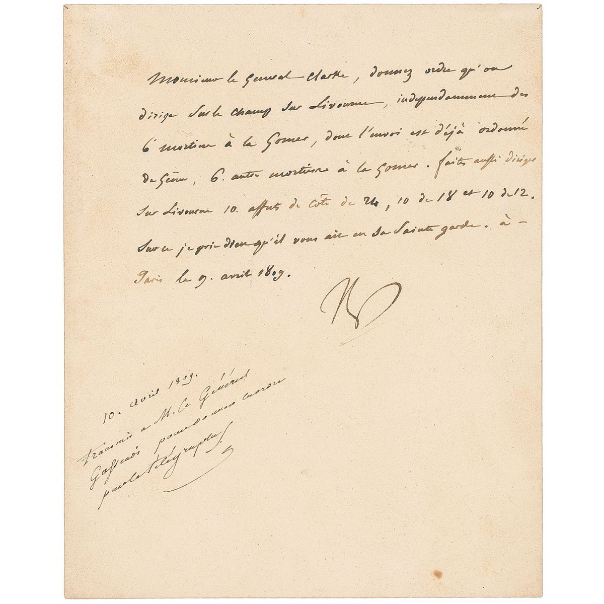 LS in French, signed “Np,” one page, 7.25 x 9, April 9, 1809. In part (translated): “Monsieur General Clarke, issue the order that, independently of the 6 mortars for the Gomes whose delivery was already ordered from Genoa, 6 more mortars for the Gomes be sent to Livorno at once. Also have 10 coastal gun-carriages for 24[-lb cannons], 10 for 18 and 10 for 12 sent to Livorno. On this I pray that God may keep you in His holy protection.” A notation from the following day reads: “Sent to General Gassendi to give the order by way of the telegraphs.” In fine condition, with central vertical and horizontal folds and mild soiling. Napoleon issued this directive during his preparations for war with Austria, suspecting an attack in the weeks ahead. As Livorno was a critical port city on Italy’s east coast, it makes sense that Napoleon wanted to reinforce the armaments of his men stationed there. However, the Austrian forces launched their attack much sooner than Napoleon expected and invaded Bavaria on April 10. Although the French were taken by surprise, Napoleon’s forces found themselves victorious in just a few months and Livorno was never threatened. A fabulous military document issued by the great tactician.