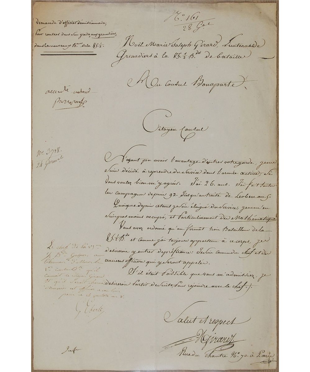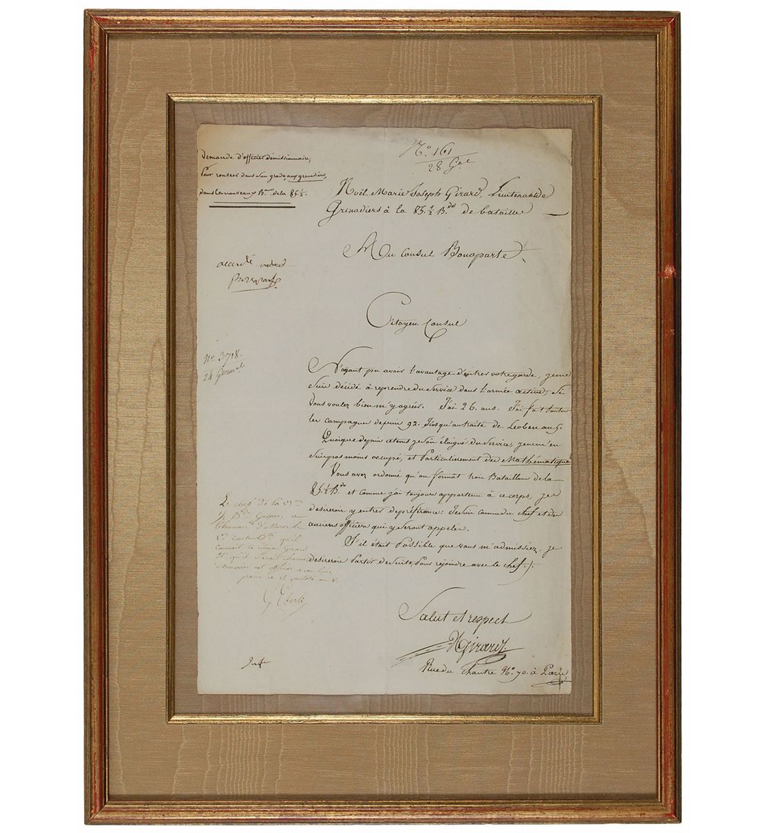 Manuscript DS in French, signed “Granted, Bonaparte,” one page, 9 x 14, circa March 1800. A military document in which Noel Marie Joseph Girard, an inactive military officer, asks to be re-enlisted into the grenadiers of a new battalion. In part (translated): “Not having been able to become a member of your own guard, I decided to go back into the active military service, if you are kind enough to agree…I have been in all military campaigns since 1792 until the treaty of Leoben [1797].” Boldly signed in the upper left by Napoleon. Handsomely cloth-matted and framed to an overall size of 14.5 x 20. In fine condition, with central vertical and horizontal folds, and light scattered creases and soiling. Accompanied by a full translation. Girard went on to a distinguished military career and was promoted as a general officer in 1831, named a baron of the empire, decorated as a knight of the Legion of Honour, and awarded membership in the Order of Saint Louis. A fantastic, well-preserved document approved by the acclaimed military tactician using a less common variation of his signature.