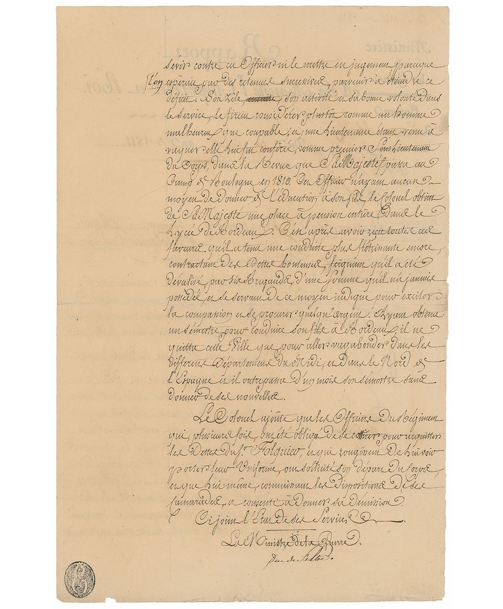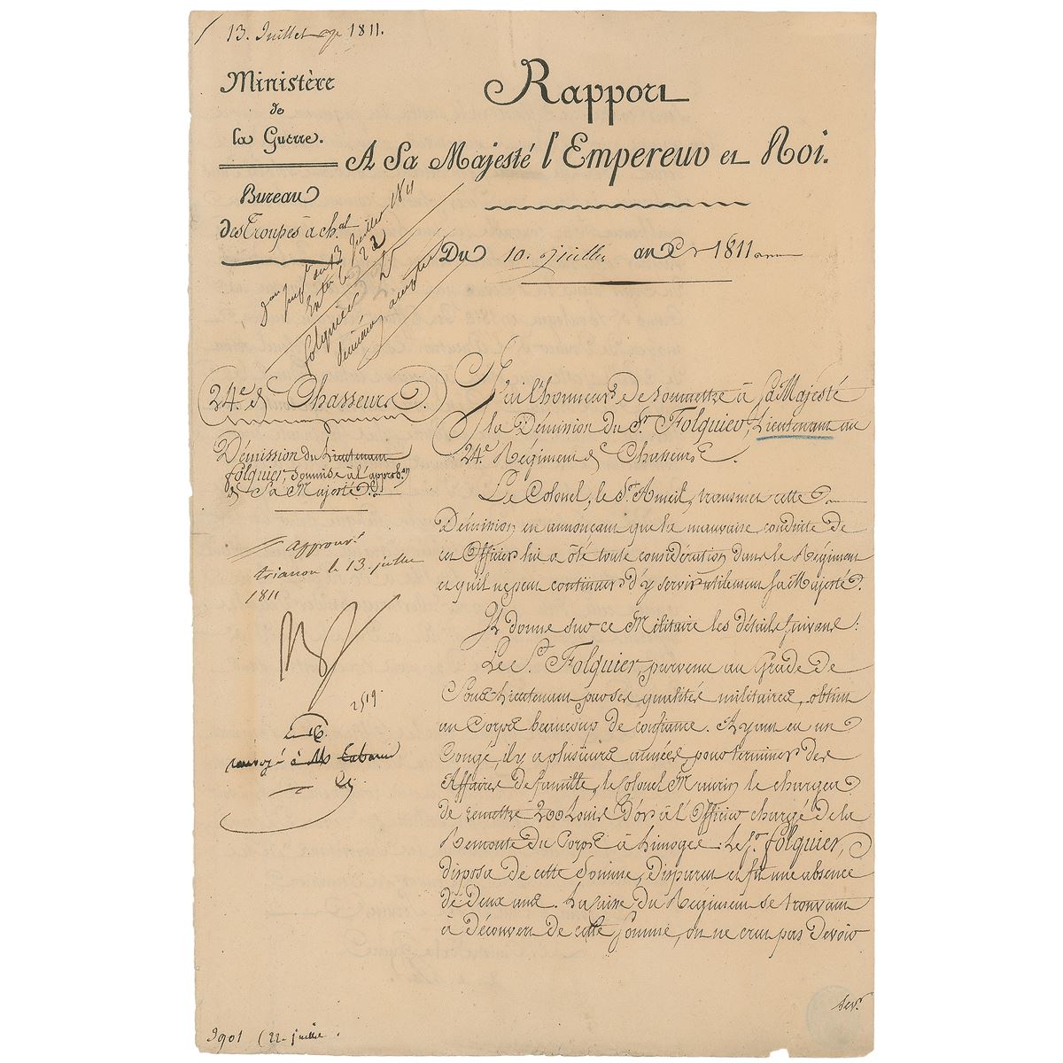 Manuscript DS in French, signed “Np,” one page both sides, 8.25 x 12.75, July 10, 1811. A report to Napoleon from Minister of War Henri Jacques Guillaume Clarke, Duc de Feltre, informing him of the resignation of Second Lieutenant Folquier because (translated) “the bad conduct of this officer…has stripped from him any consideration in the Regiment…he cannot continue to be of useful service to His Majesty.” Signed at the conclusion by Clarke and prominently approved in the left margin by Napoleon three days later. In fine condition, with expected document wear and light soiling. The report describes Folquier’s shady financial dealings, his bumming around in the the south and in Spain, and his late return from leave, all clear evidence of his poor performance.