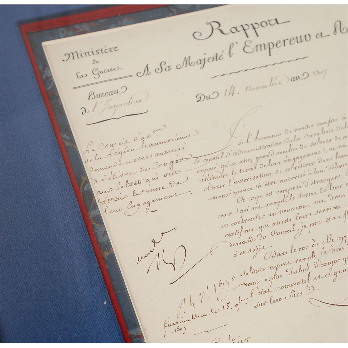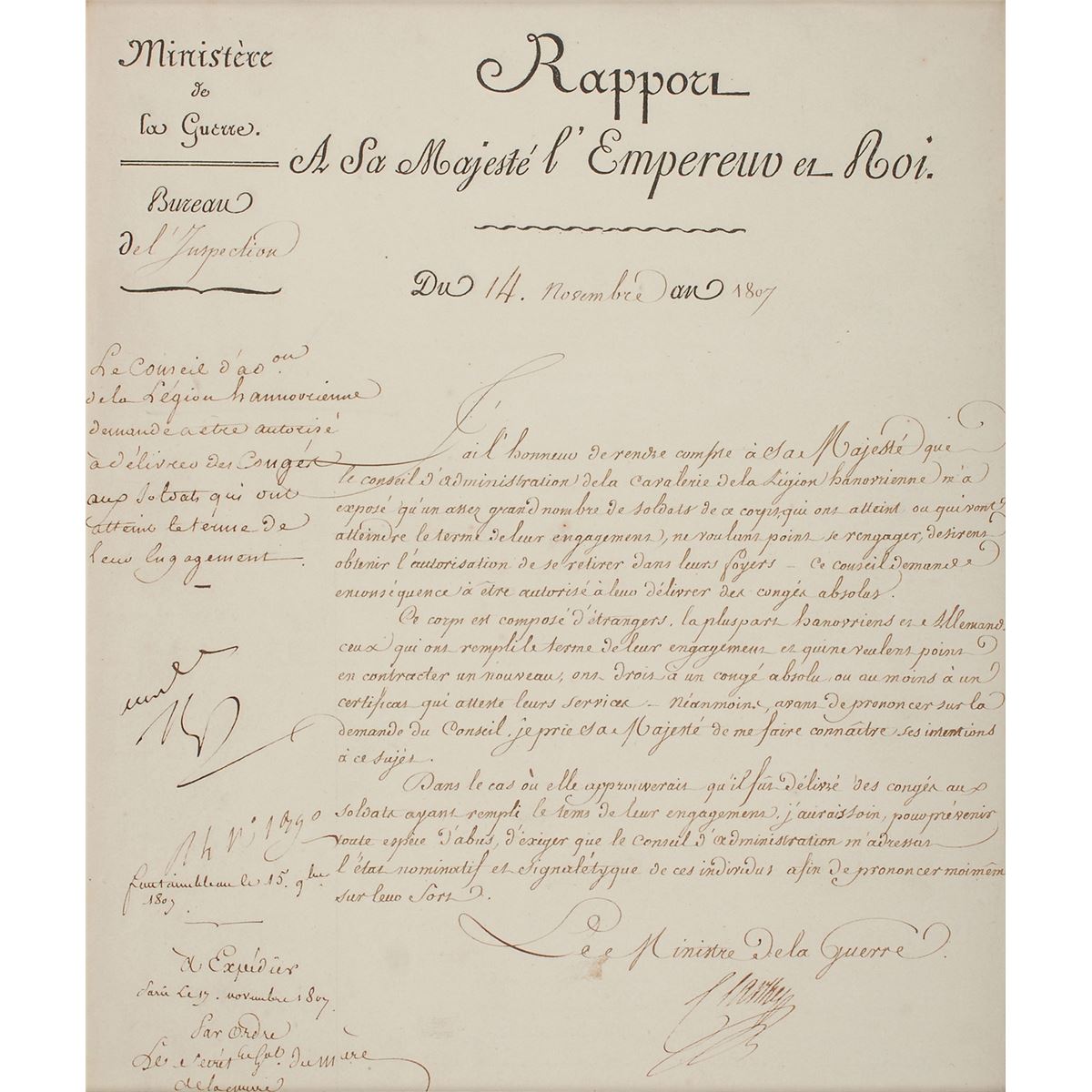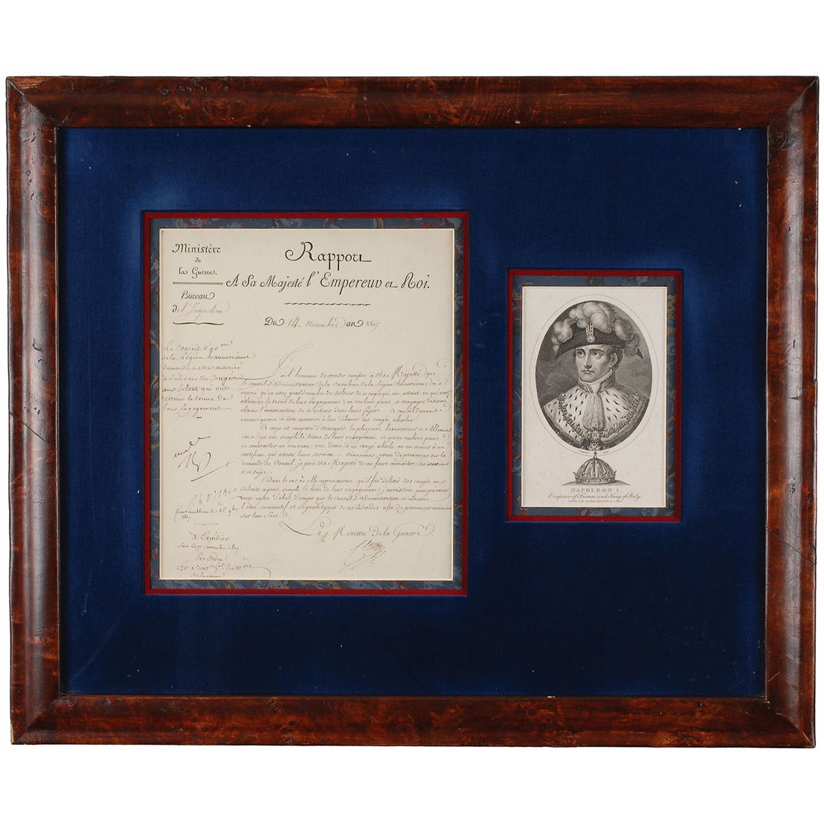 Manuscript DS in French, signed “Np,” one page, 8.5 x 10, November 14, 1807. A Ministry of War document. In part (translated): "The Administrative Council of the Hanoverian Legion requests that it be authorized to give discharges to those soldiers who have completed their term of enlistment…This corps is composed of foreigners, most of them Hanoverians or Germans; those who have completed the terms of their enlistment and who do not wish to reenlist have the right to a final discharge or at least to a certificate attesting to their service. Nevertheless, before answering the council’s request, I respectfully request His Majesty to let me know his intentions on this subject.” Beautifully triple-suede-matted and framed with an engraved portrait to an overall size of 23.5 x 19.5. In fine condition, with expected document wear. The Hanoverian Legion was established by General Mortier in 1803 and was intended to include both infantry and cavalry troops, but difficulties in recruitment and in general—desertion and sickness among them—resulted in never filling the ranks, and the legion was reorganized several times before being disbanded in 1811.