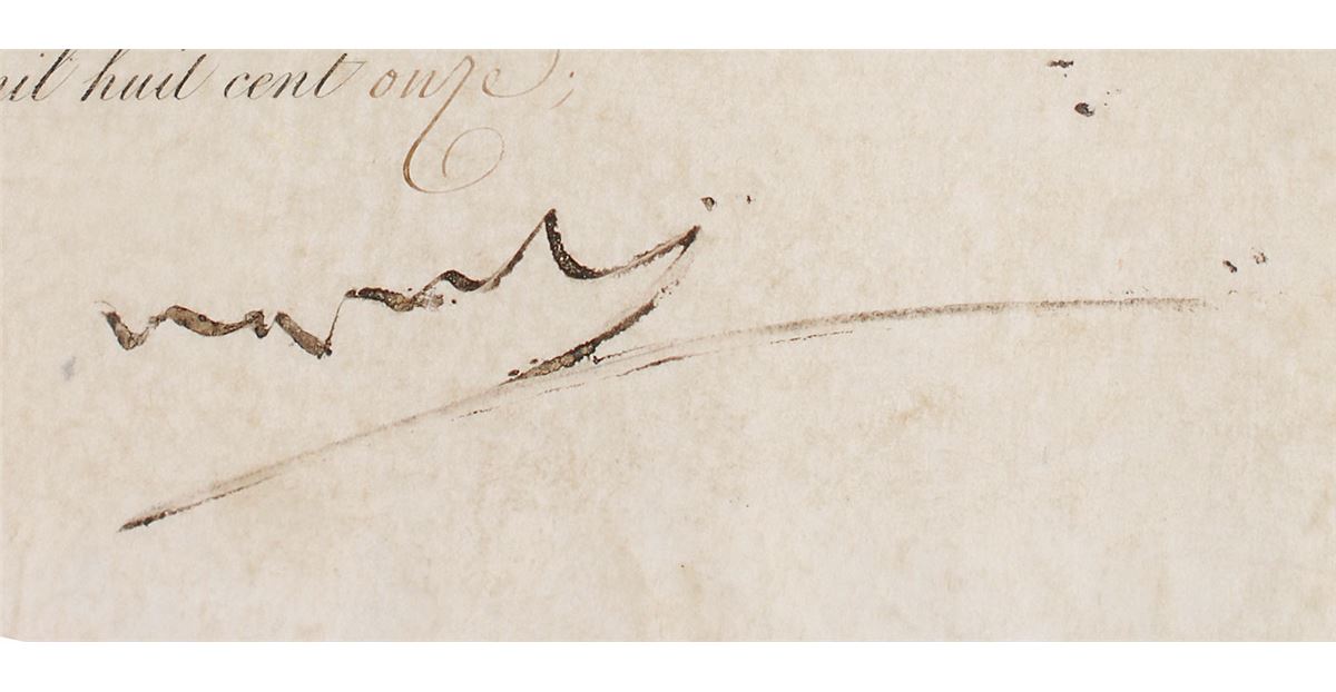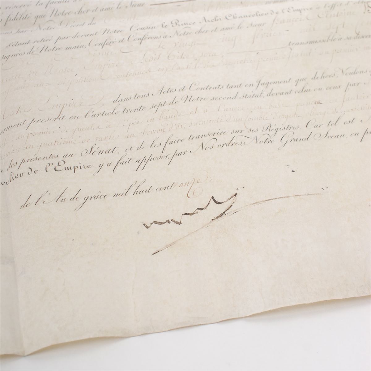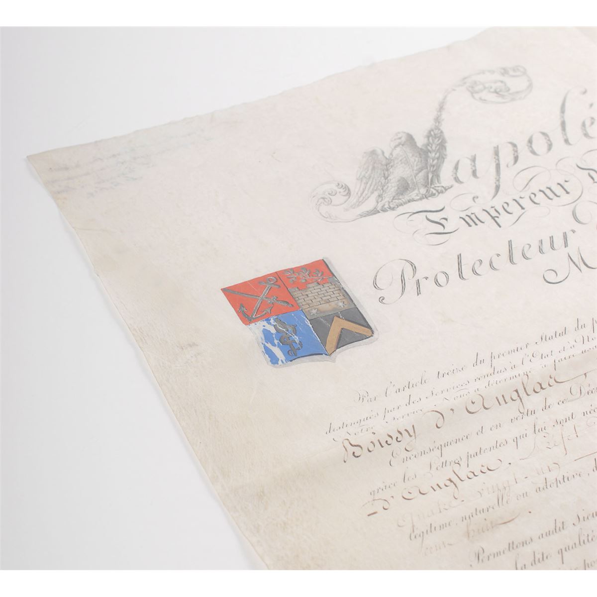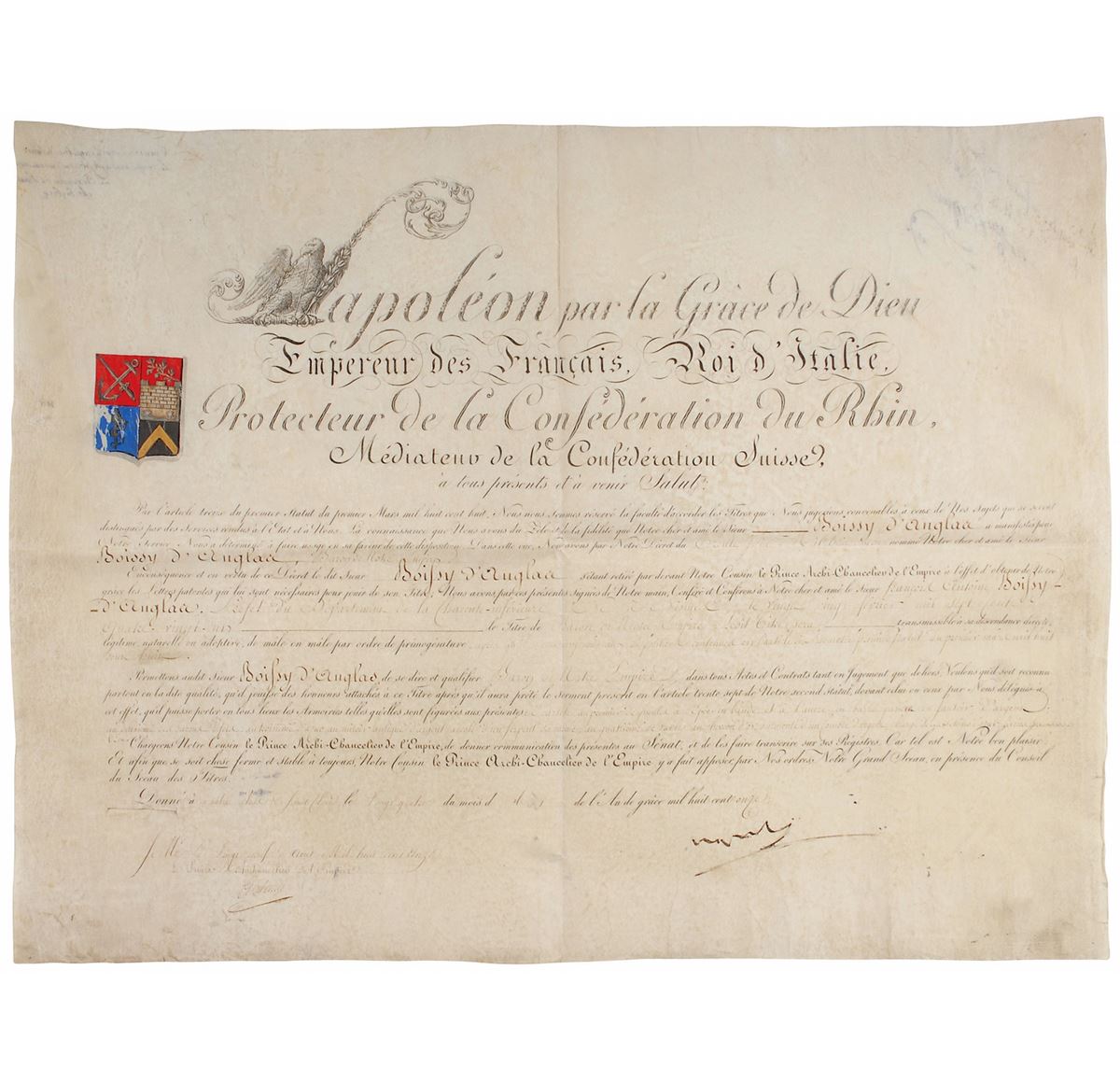 Partly-printed DS rapidly signed “Napol,” one page, 23.25 x 17.75, August 24, 1811. Document conferring the title of “Baron of Our Empire” upon Francois Boissy-d’Anglas, specifying the elements of the armorial device he is authorized to wear. A beautifully hand-painted rendering of the crest of the newly minted title, as described in the document, is present in the upper left. Document is also countersigned by Prince Cambaceres, Arch-Chancellor of the Empire, Second Consul with Napoleon, and chief author of the Napoleonic Code. Central vertical and horizontal folds, wear to a portion of the hand-painted heraldic crest, and most writing light but legible, otherwise fine condition. The recipient, son of the prominent statesman of the same name, was one of Napoleon’s prefects from 1810 through 1814. A boldly signed, unusual format with a distinctive hand-painted coat of arms.