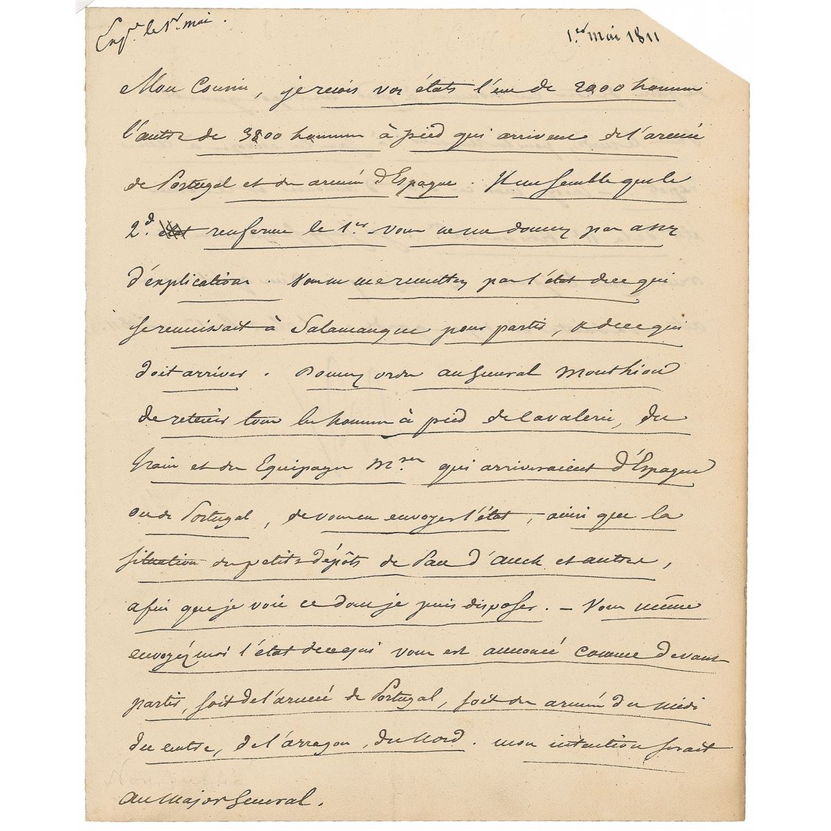 LS in French, signed “Np,” one page both sides, 7.25 x 9, May 1, 1811. Letter to a Major General. In part (translated): “I received both your statements about 2,000 men and 3,800 men on foot who have arrived from the Army of Portugal and the Army of Spain. It seems to me that the 2nd includes the 1st. You don't give me sufficient explanation. You don't send me a report on those who assembled a Salamanca for departure, and those who are to arrive. Give orders to Gen. Monthiou to hold back all the foot soldiers from the Cavalry and the Baggage Trains that will arrive from Spain or Portugal. Ask him to send you a report on the small depots in Pau, Auch and others so that I can see which ones I have at my disposal. You yourself are to send me a statement…about those who are to leave, either from the Army of Portugal, the Army of the South, of the Center, of Aragon, of the North.” In fine condition, with central vertical and horizontal folds lightly passing through the signature, scattered creases, and a clipped corner. Accompanied by a full letter of authenticity from PSA/DNA.