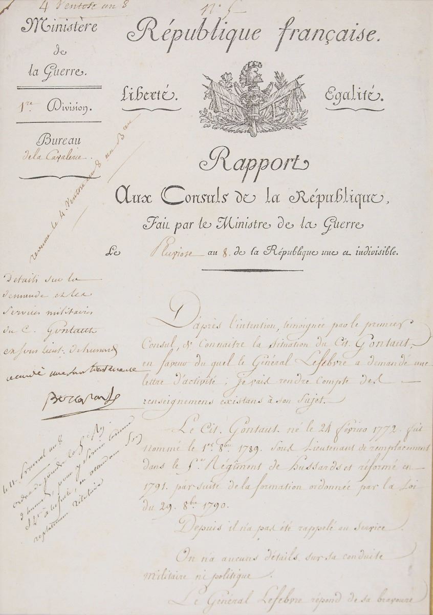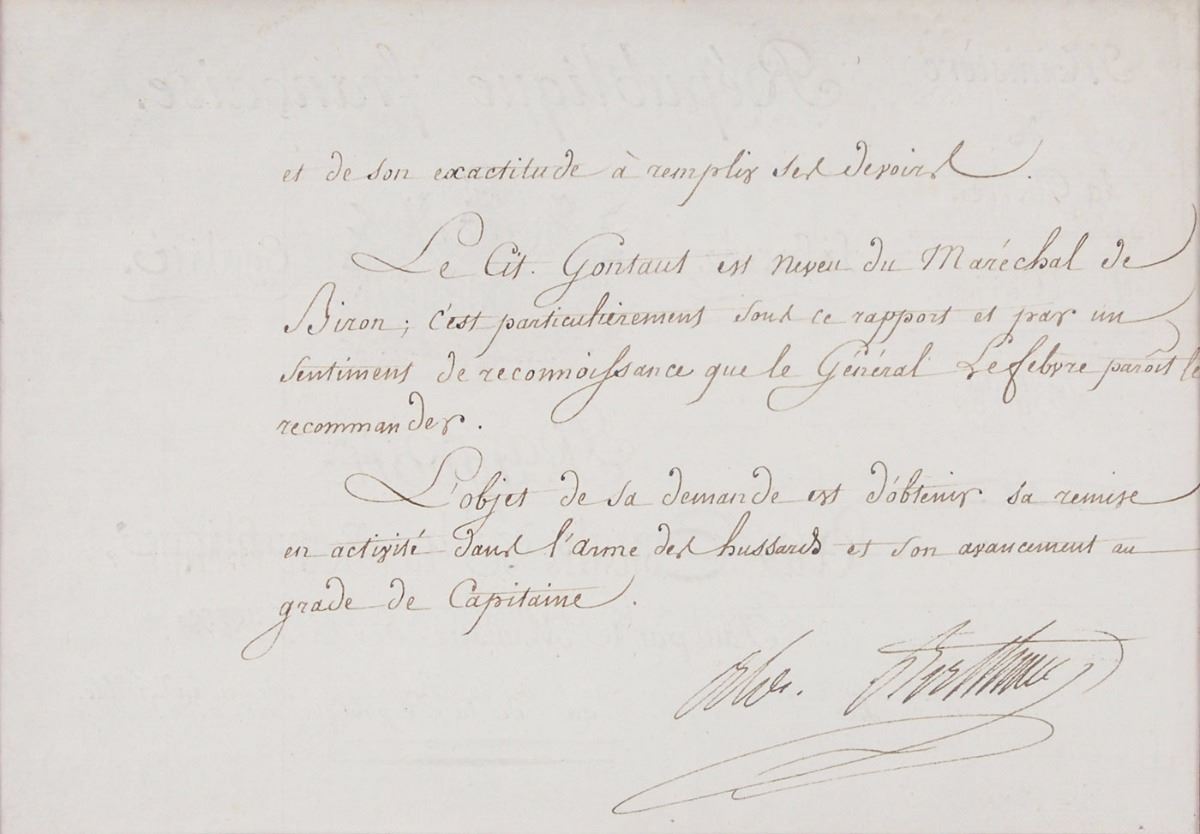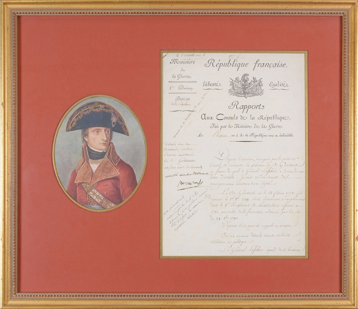 Manuscript DS in French, signed “Bonaparte,” one page, 8.25 x 11.75, February 1800. In part (translated): “According to the plan evinced by the First Consul to know the state of affairs of Citizen Goutaut on behalf of whom General Lefebvre has requested a prompt letter concerning his activity, I am going to give an account on this subject. Citizen Goutaut, born February 24, 1772, was named second lieutenant on August 1, 1789, as a replacement in the first regiment of Hussars. He was invalided out of the service in 1791 in accordance with the law of August 29, 1790. Since then he has not been recalled to the service. We have no details on his military or political conduct. General Lefebvre answers for his courage and his accuracy in completing his duties. Citizen Goutaut is a nephew of Marshal Siran. It is especially in this regard and through a feeling of gratitude that General Lefebvre seems to recommend him the object of his request is to have him reentered in active service in the army of Hussars and his advancement to the rank of captain.” Signed in the left margin by Napoleon. Nicely double-matted and framed with a color portrait to an overall size of 20.5 x 17.5, with a glass backing to view docketing on the reverse. In fine condition, with expected document wear.