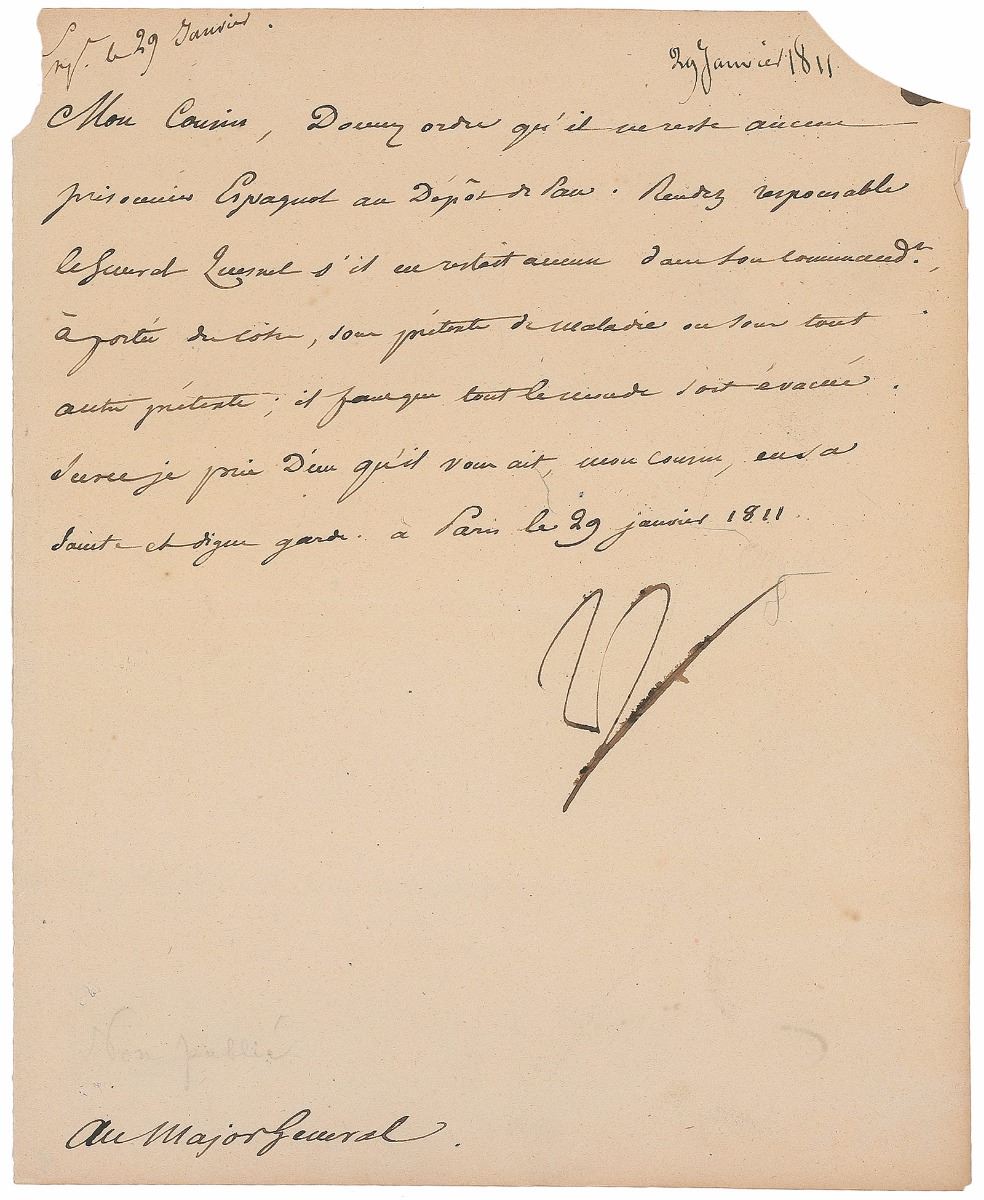 LS in French, signed “Np,” one page, 7.5 x 9, January 29, 1811. Letter to his chief of staff, General Louis-Alexandre Berthier, concerning the evacuation of Spanish prisoners from the Depot de Paris, in part (translated): “Give the order that no Spanish prisoners remain at the Depot de Paris. Make General Quesnel responsible if anyone is left under your Command under pretext of illness or any other pretext; it is necessary that everyone be evacuated.” In fine condition, with light creases, paper loss to upper corners, and a bit of feathering to ink in the signature.