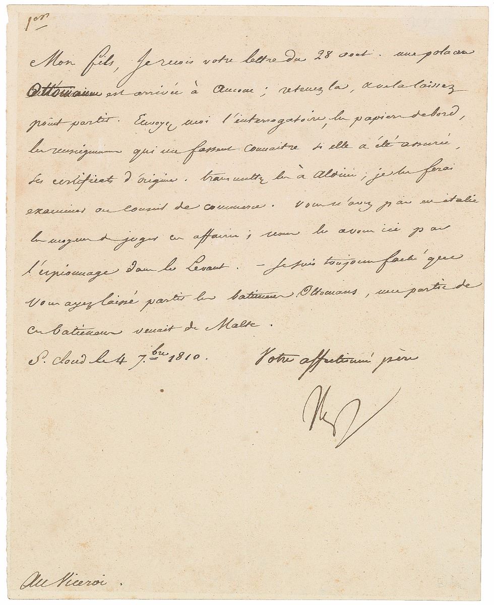 LS in French, signed “Np,” one page, 7.25 x 9, no date. Letter to his son, in part (translated): “I received your letter of August 28th—an Ottoman ship has arrived at Aucone—hold it—do not let it leave. Send me the interrogation and the ship’s papers—the information which will let me know if it has been insured and its certificate of origin…I will have them examined at the Council of Commerce. In Italy you do not have the means of judging these matters. We have them here through espionage in the Levant. I am still angry that you allowed the Ottoman to leave—some of them came from Malta.” In fine condition, with two small mounting remnants to reverse of top edge.