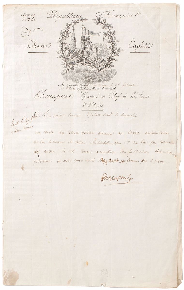Manuscript DS in French, signed “Bonaparte,” one page, 9.25 x 14.75, December 16, 1796. Official French Republic Italian Army military order issued to General Baraguay d’Hilliers. In full (translated): "You would please, Citizen General, tell the citizen Andrea Verne, now being held in the citadel, that if he doesn’t let us know the perpetrators of the robberies committed at the house of the Archduchess I will give the order for him to be imprisoned in France.” Boldly signed at the conclusion using his surname. In fine condition, with a crease to the upper right and a stain to the lower left corner. Intriguing content from early on in Napoleon’s campaign through Europe.