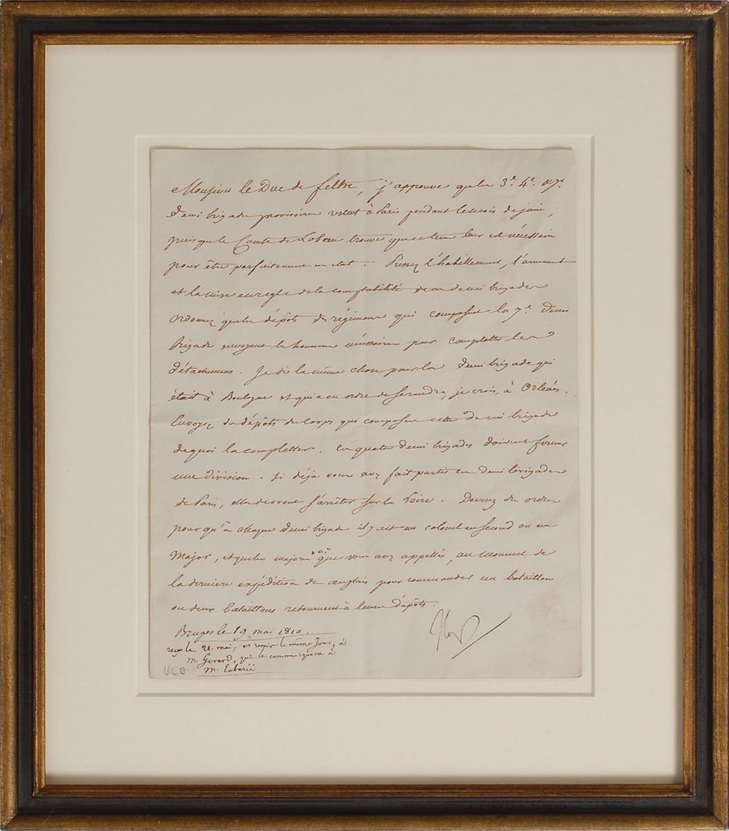 ALS in French, signed “NP,” one page, 7.25 x 9, May 19, 1810. Letter to the Duke of Feltre, in full (translated): “I approve that the 3rd, 4th, 7th temporary half brigade remain in Paris during the month of June; since the Count of Loban finds that this is necessary for them to be in perfect condition. Take the clothing, the armament ensures the accountancy for a half brigade. Order that the departure of the regiment, which composes the 7th half brigade, send the necessary men to complete the detachment. I say the same thing for the half brigade which was in Boulogne and who has orders to join, I believe in Orleans. Send the quarterings of troops, which compose this half brigade, enough to complete it. With four half brigades it should form a division. If you already have sent a half brigade from Paris, it will have to stop only at the Loire. Give orders so that each half brigade have a Colonel in uniform or a Major, and some Majors that you have called during the last expedition against the English to command a battalion or two battalions returning to their quarterings.” Mounted, framed, and in fine condition, with intersecting folds.