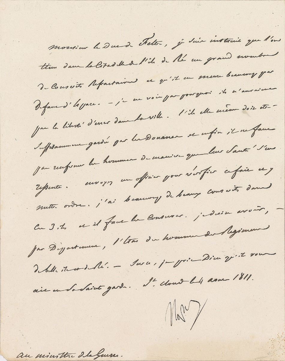 LS in French, signed “Napol,” one page, 7.25 x 9, August 4, 1811. Letter to the Duke de Feltre, the minister of war. In part (translated): "I’ve been informed that a large number of my refractory draftees are being held in the Citadel of the Island of Re and that many of them are dying because of cramped quarters. I can’t see why they shouldn’t have the freedom of walking about at will in the city. The island is probably sufficiently guarded by customs officials and the men should not be confined in such a manner as to affect their health. Send an officer to check on conditions and create good order. I have many fine draftees on those 3 islands and they have to be looked after. I want to know, by Departments, the condition of the men of the Belle-Isle and Island of Re regiments.” In fine condition. Interesting military content from the height of his empire in the year prior to his invasion of Russia.