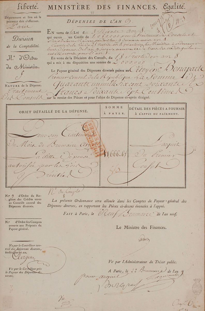 Handsome partly-printed DS, signed “Bonaparte,” one page, 9 x 14, 22 Brumaire Year IX [November 13, 1800]. Untranslated Ministry of Finance salary statement, neatly signed at the conclusion by Napoleon using his surname. Mounted, matted, and framed with an original painting by WWII combat artist Richard Gibney to an overall size of 29.5 x 24. In fine condition, with expected document wear.