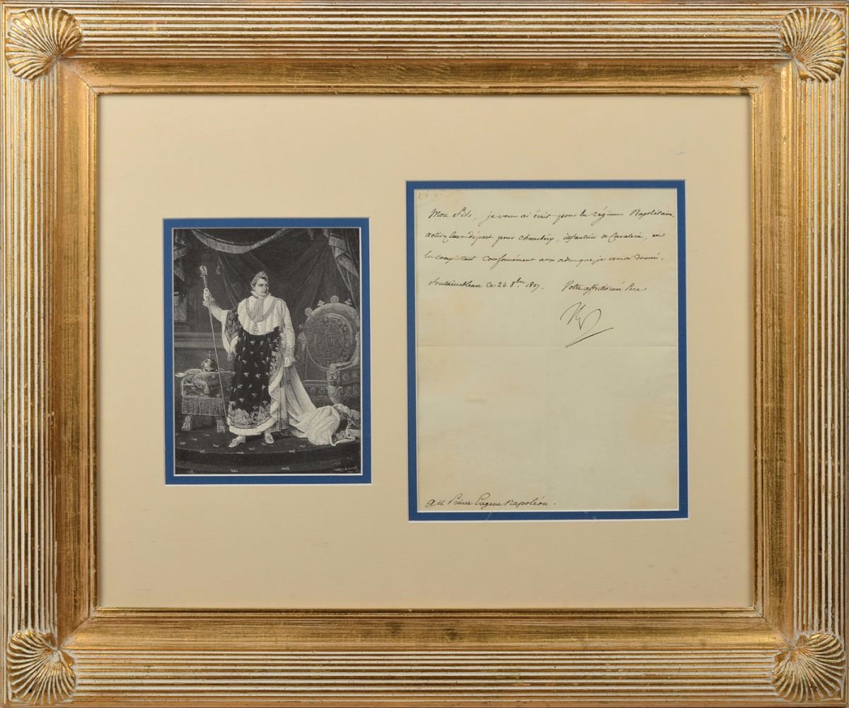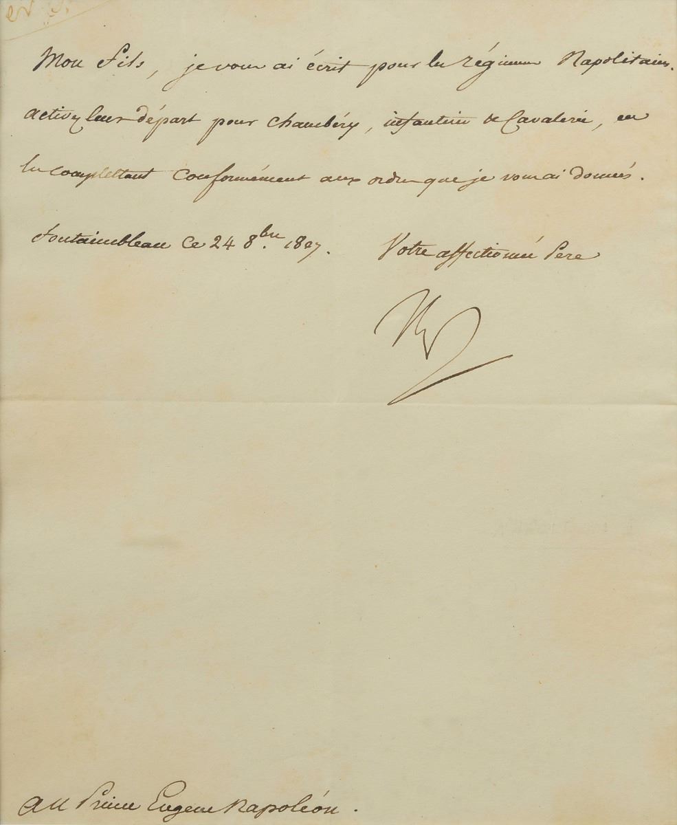 LS in French, signed “NP,” one page, 7 x 8.5, October 24, 1807. Written from Fontainebleau, a letter to his son Prince Eugene Napoleon, in full (translated): "My son, I have written to you to speed up the departure of the Napolitan regiments to Chambery, mounted infantry quarters, completing it in accordance with the orders I have given you." Double-matted and framed with an engraved portrait to an overall size of 22.75 x 18.75. In fine condition, with intersecting folds and light rippling to the right edge.