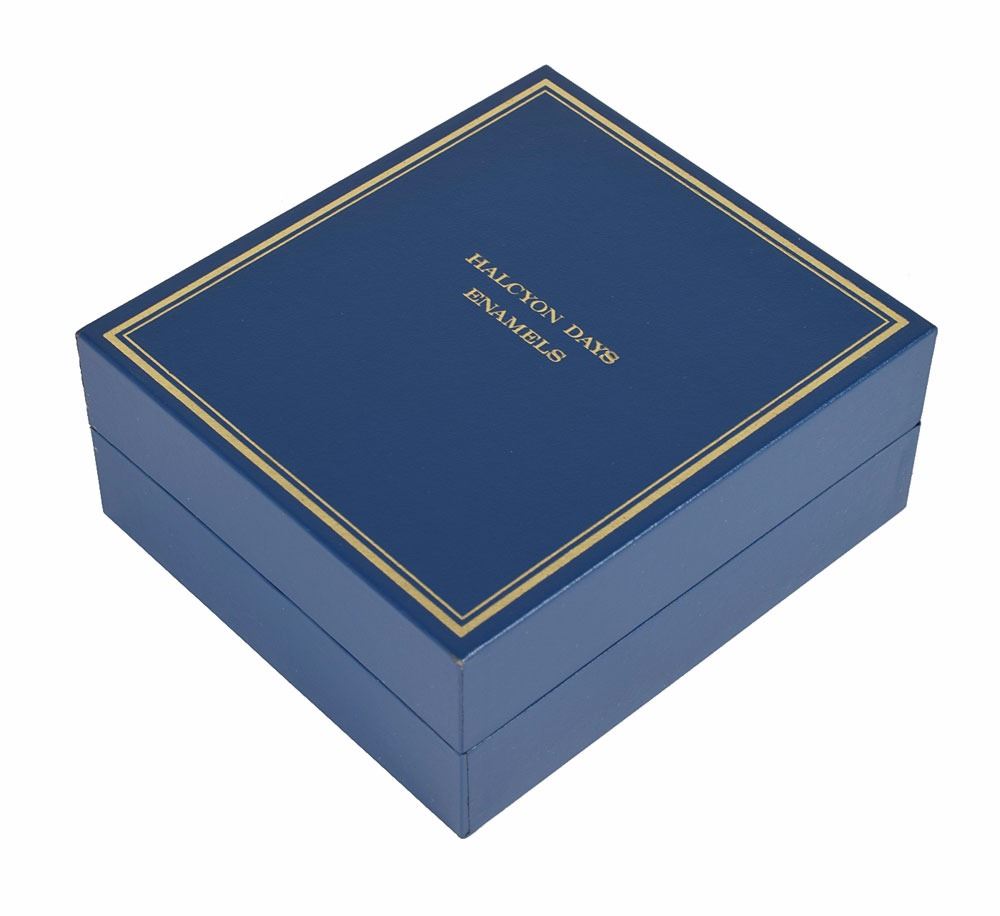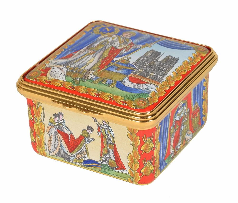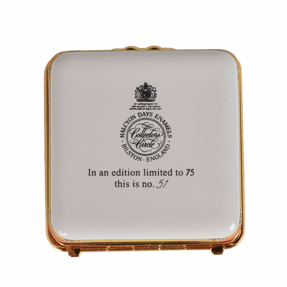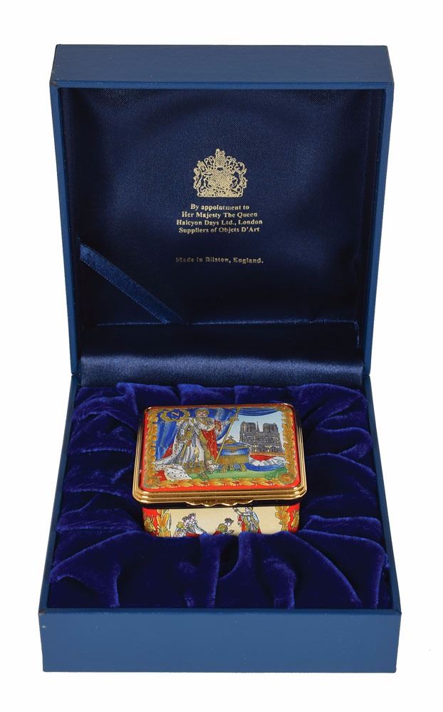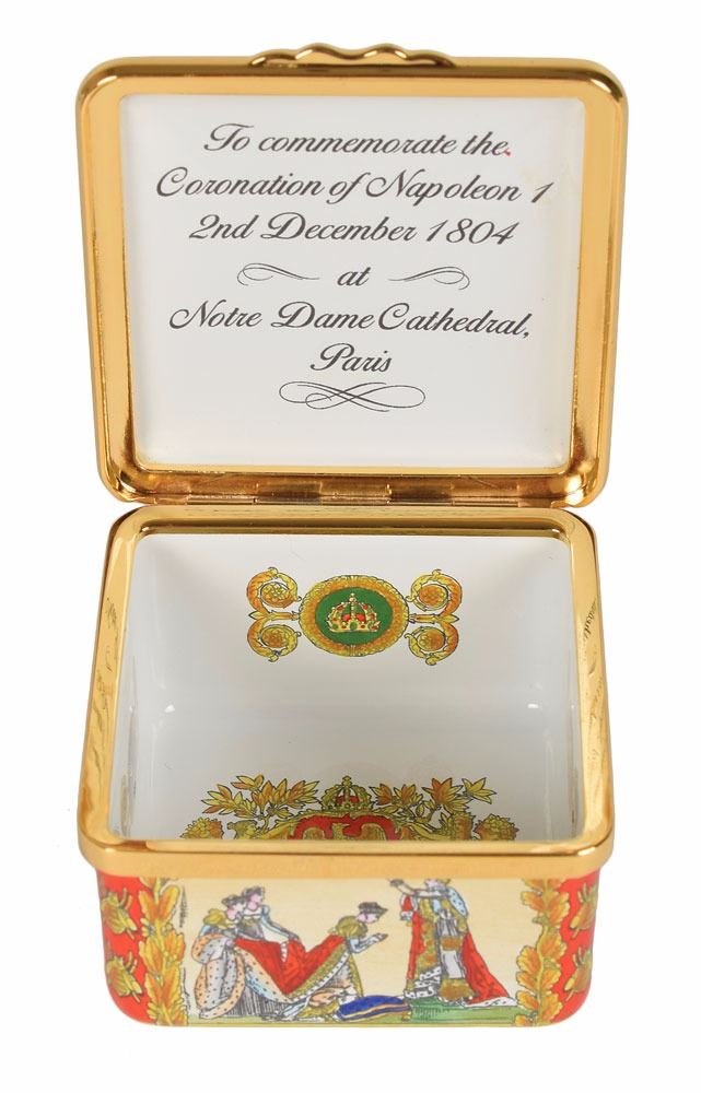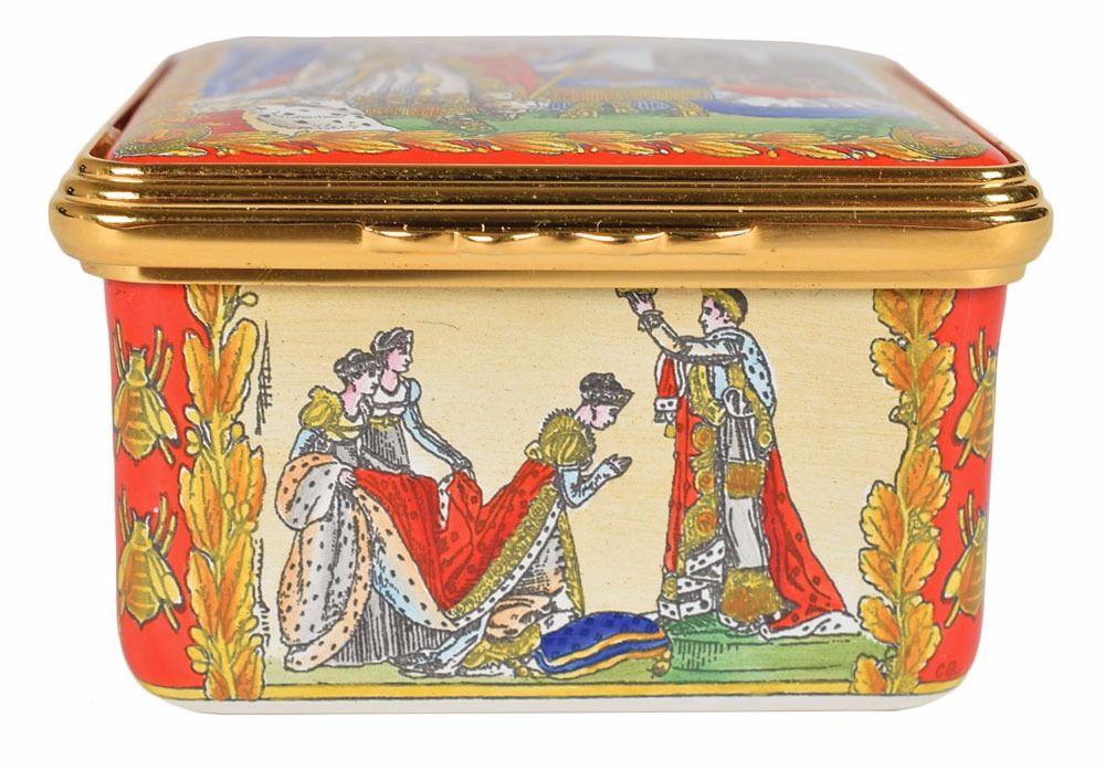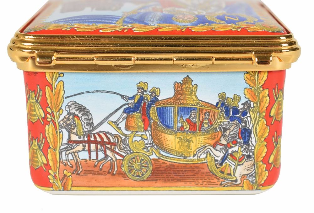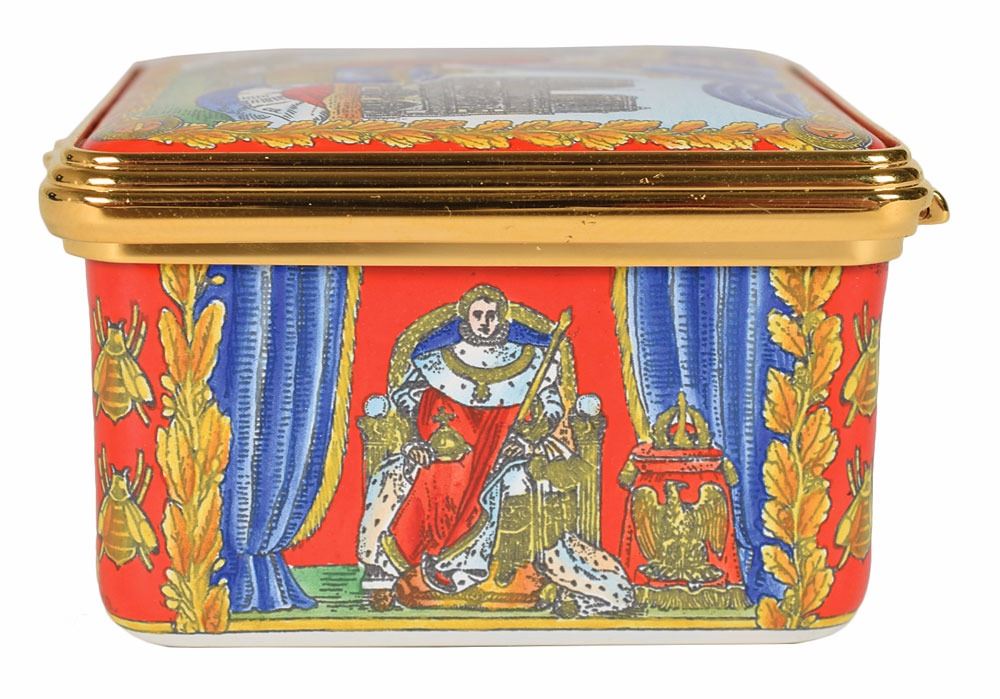 Small limited edition enameled trinket box made by Halcyon Days in Bilston, England, 2 x 2 x 1.25, numbered 51/75, honoring the bicentenary of the coronation of Napoleon Bonaparte as emperor of France. In fine condition. Accompanied by the original box and certificate of authenticity.