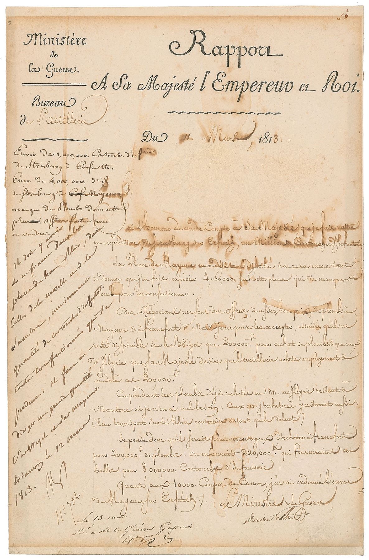 Manuscript DS in French, signed “Np,” one page, 7.75 x 12, March 11, 1813. Official military report, endorsed in the left margin by Napoleon after a long passage written in another hand. In very good condition, with toning, dampstaining, and old mounting remnants in the reverse.