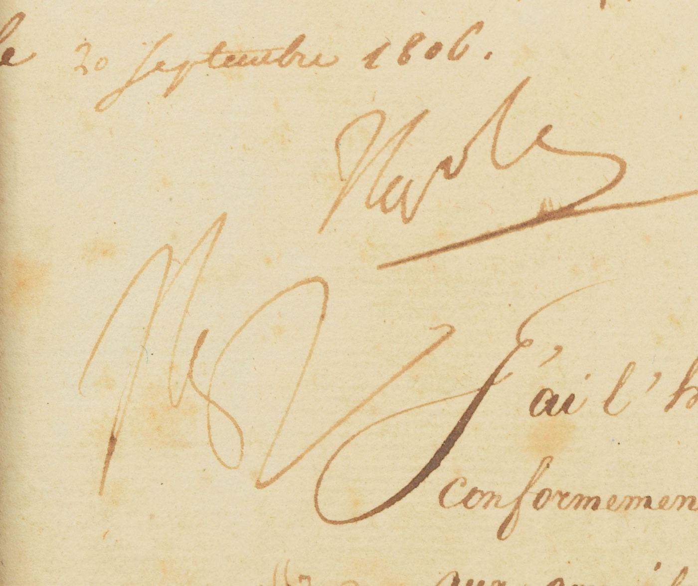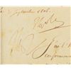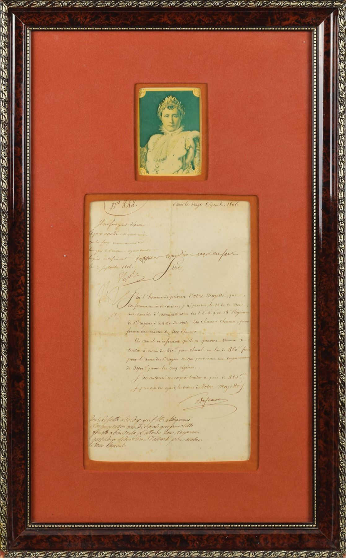 Manuscript DS, in French, signed “Napole" and "Np,” one page, 7.25 x 11.5, September 20, 1806. Untranslated military document concerning the raising of a cavalry regiment, endorsed at the top by Napoleon with a multi-word approval, signing twice below. Impressively double-cloth-matted and framed to an overall size of 15 x 24. In very good to fine condition, with scattered light foxing and intersecting folds. It is rare to find a Napoleon document with more than a single-word endorsement, much less two signatures from the esteemed French commander. A spectacular military document from the legendary Bonaparte.