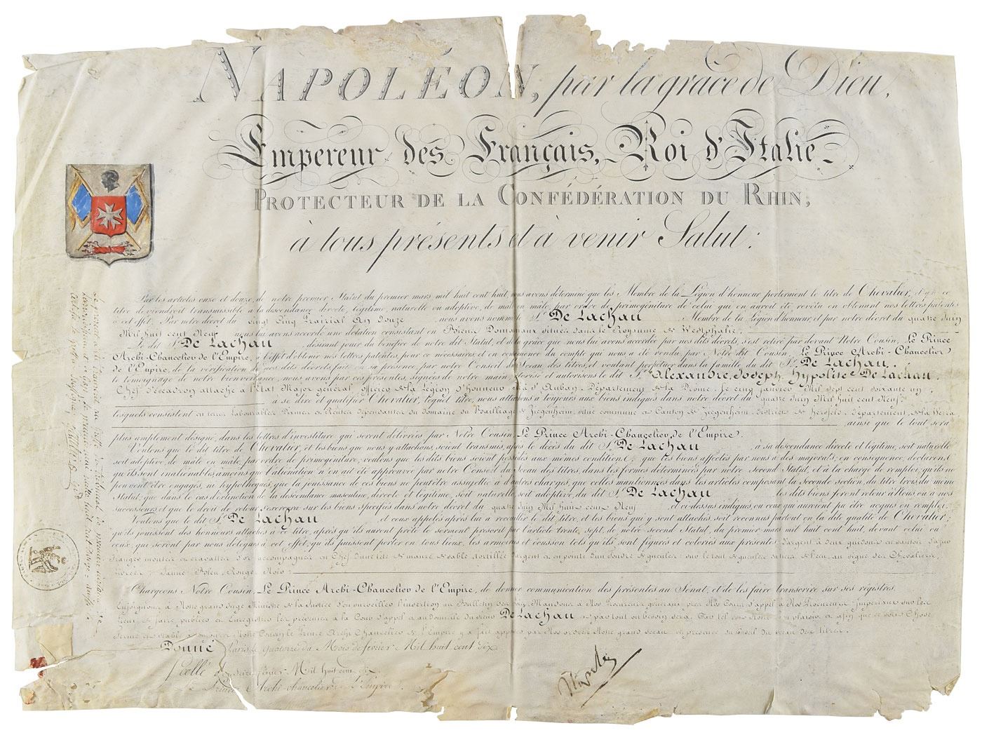 Partly-printed vellum DS, signed “Napole,” one page, 20.25 x 14.75, February 14, 1810. Document naming Alexandre Joseph Hypolite de Lachau as "chevalier de l'Empire," issued by Napoleon as Emperor of the French and King of Italy, boldly signed in the lower margin by Bonaparte. The upper left features a hand-painted rendition of the armorial crest awarded to de Lachau. In very good condition, with tears and paper loss to the edges, and tape on the reverse reinforcing a tear above the signature.