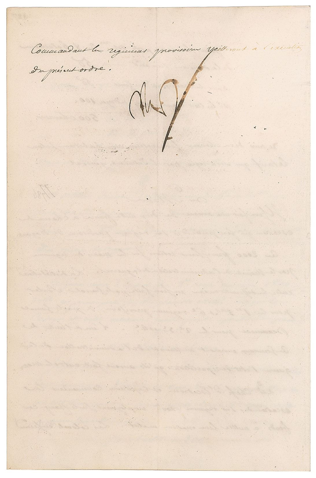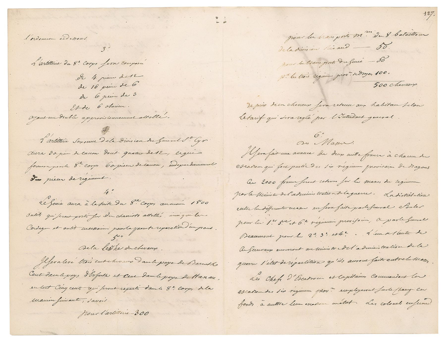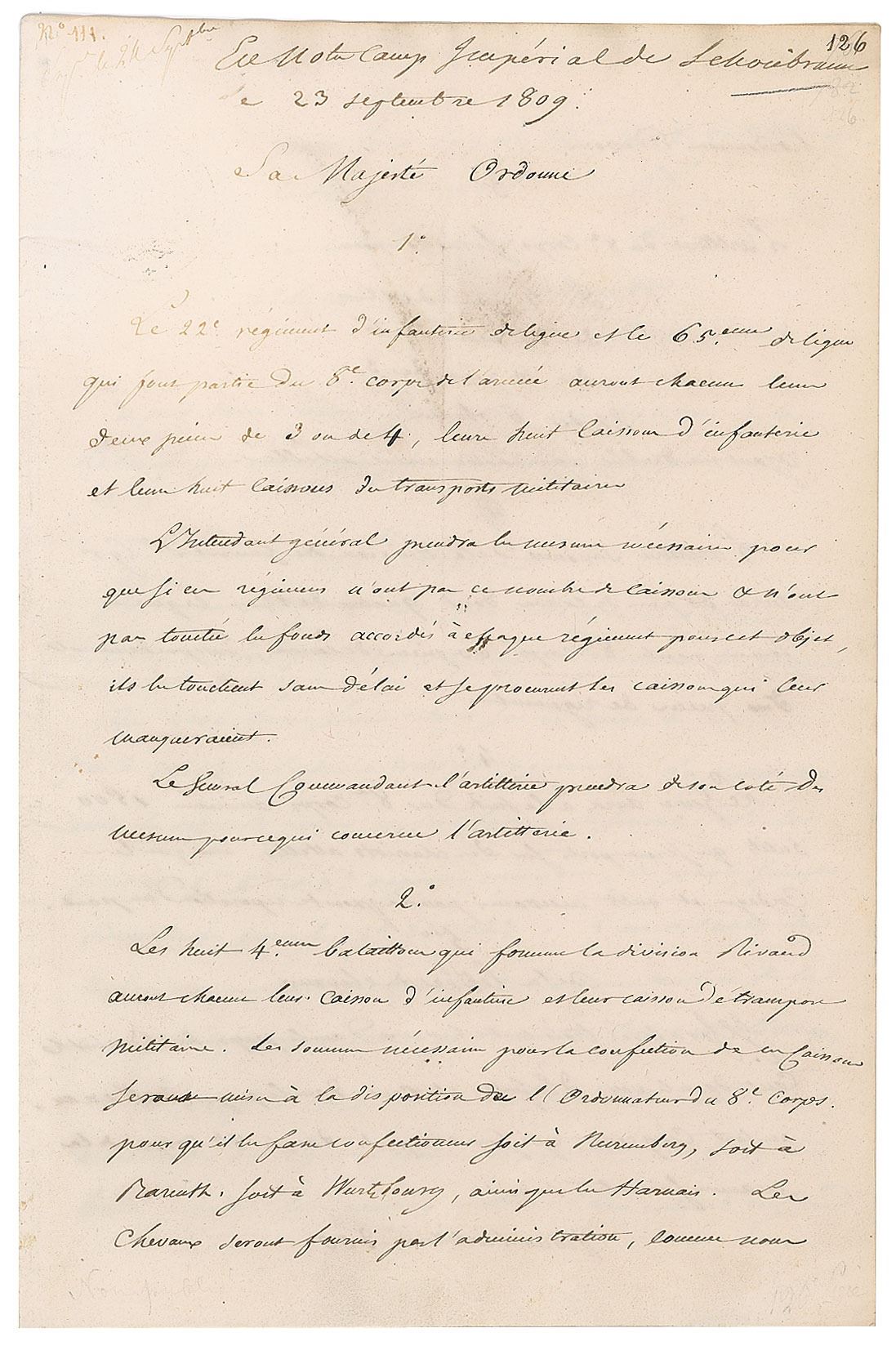 LS in French, signed “Np,” four pages on two adjoining sheets, 8 x 12, September 23, 1809. Official order reorganizing his troops amidst the War of the Fifth Coalition, a few days before the Treaty of Schonbrunn ended it. In part (translated): "In our Imperial camp of Schonbrunn, His Majesty orders: 1. The 22nd infantry regiment of the line and the 65th of the line, which are part of the 8th corps of the army, will each have their two pieces of 3 or 4, their eight infantry caissons and their eight caissons of military transports. The Intendant General will take the necessary measures so that if these regiments do not have this number of caissons and have not touched the funds granted to each regiment for this purpose, they procure the missing caissons without delay…2. the eight 4th battalions which form the Rivaud division will each have their infantry caisson and their military transport caisson. The sums necessary for the design of these caissons will be placed at the disposal of the authorizing officer of the 8th Corps…The horses will be provided by the administration…3. The artillery of the 8th corps will be composed of 4 pieces of 12; 16 pieces of 6; 6 pieces of 3; and 6 howitzers, with a double coupled supply…4. The engineers will have…at least 1500 tools which will be worn on coupled wagons, as well as the ropes and tools necessary for the prompt repair of a bridge…5. Three hundred horses will be raised in Bareuth, one hundred in Erfurth, and one hundred in Hanau. In all five hundred, which will be distributed in the 8th corps…6. An advance of two thousand francs will be made to each squadron…The squadron leaders and captains commanding the squadrons of the six provisional regiments will immediately employ this fund to put their squadron in order." In fine condition.